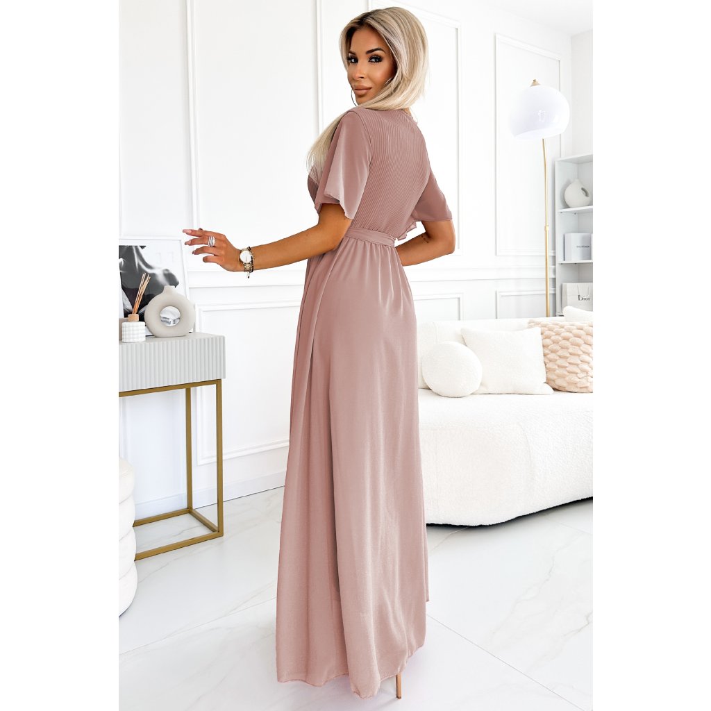 Dlouhé šaty s plisovaným výstřihem a zavazováním - taupe 545-6 - výprodej