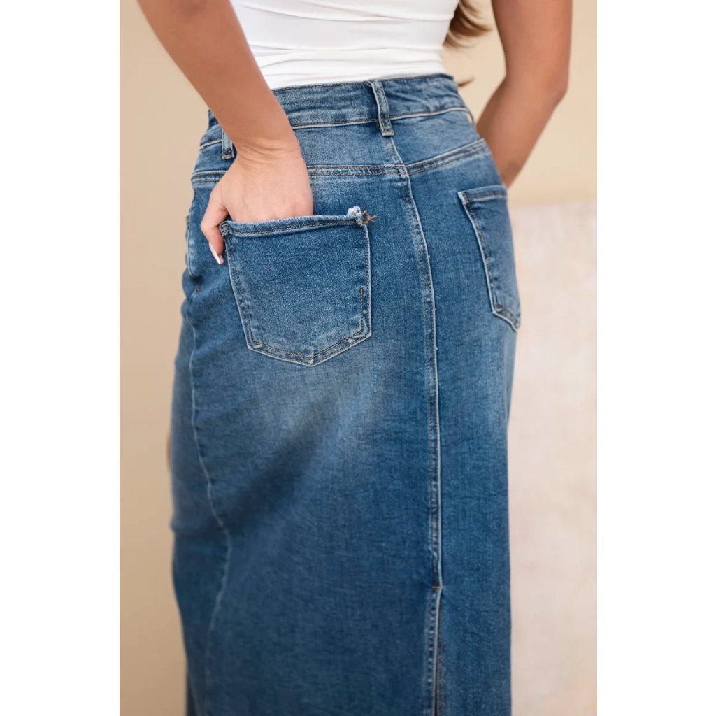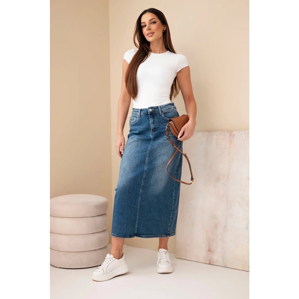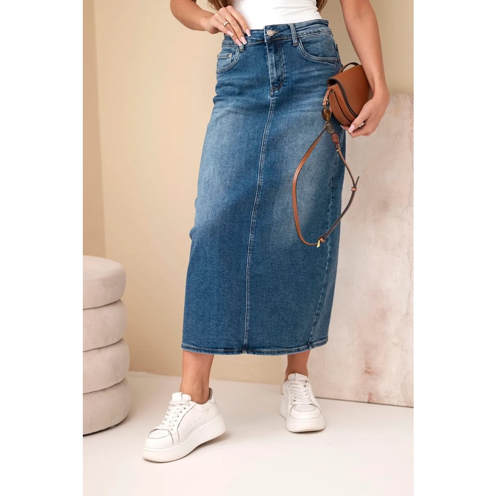 Klasická midi džínová sukně M.Sara ME388 je ideální volbou pro ženy, které si cení jednoduchosti, pohodlí a nadčasového stylu. Vysoký pas krásně zdůrazňuje pas, zatímco midi délka dodává celkovému vzhledu eleganci a jemnost. Je vyrobena z pružného denimu, dobře obepíná siluetu a zároveň poskytuje volnost pohybu. Sukně se hodí jak k ležérním outfitům, tak k elegantnějším outfitům.