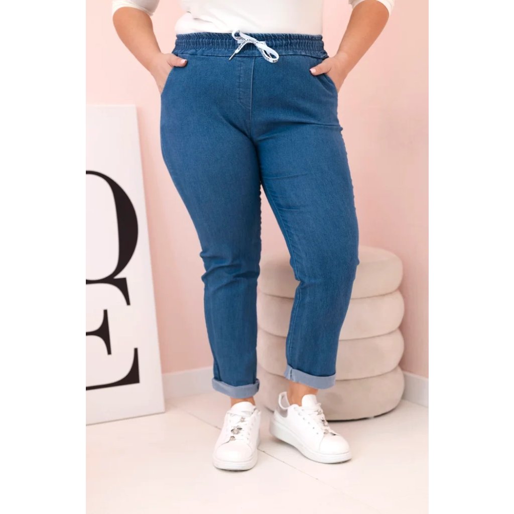 Pokud si ceníte pohodlí a módního vzhledu v každodenním stylu, tyto dámské džínové kalhoty s elastickým pasem budou ideální volbou! Vyrobeny z měkkého, pružného materiálu, zajišťují maximální pohodlí po celý den. Díky stahování v pase na šňůrku se dokonale přizpůsobí postavě, volný střih a ohrnuté nohavice dodávají celkově ležérní, neformální styl. Skvělá volba pro každý den – na procházku, nákupy nebo neformální setkání s přáteli. Džínová struktura a univerzální design zajišťují snadné kombinování s tričkem, mikinou nebo svetrem.