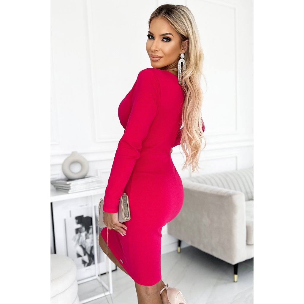Elegantní šaty s psaníčkovým výstřihem a dlouhým rukávem. Vyrobeno z mírně elastické bavlněné látky ve fuchsiové barvě. Zapínání vzadu na skrytý zip. Značka Numoco. Polská výroba.
