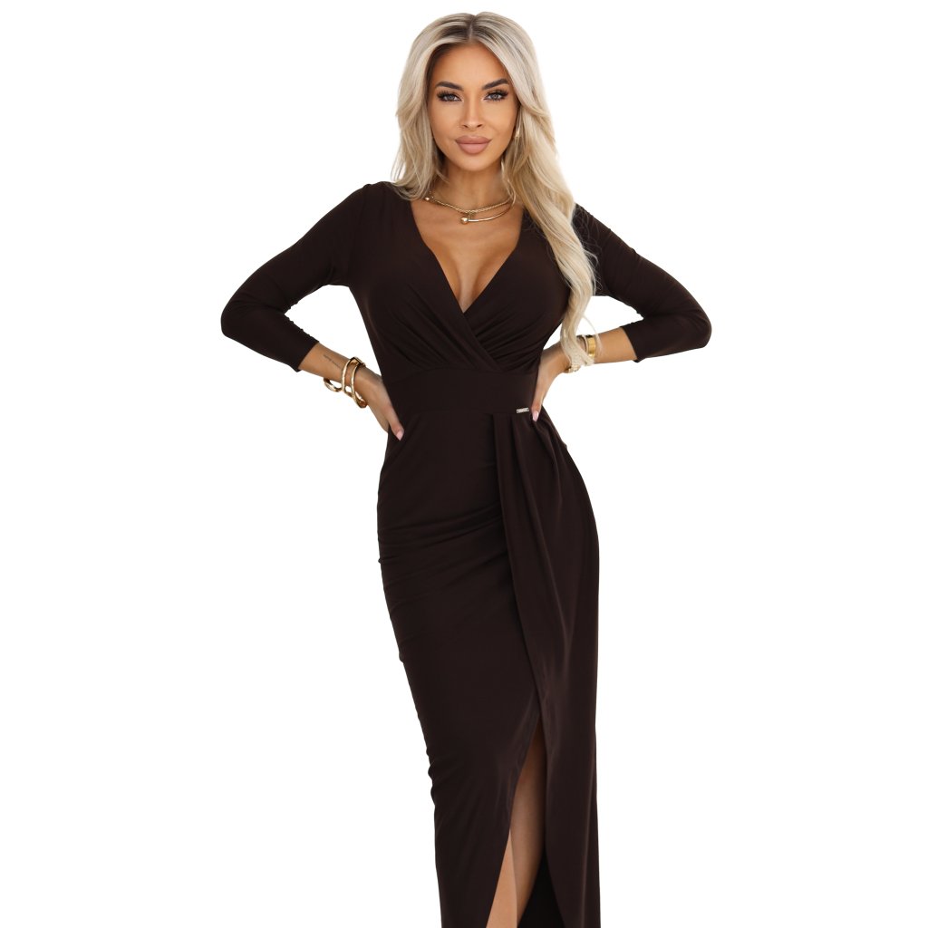 Elegantní dlouhé šaty s zavinovacím výstřihem a rozparkem - čokoládově hnědé 404-14