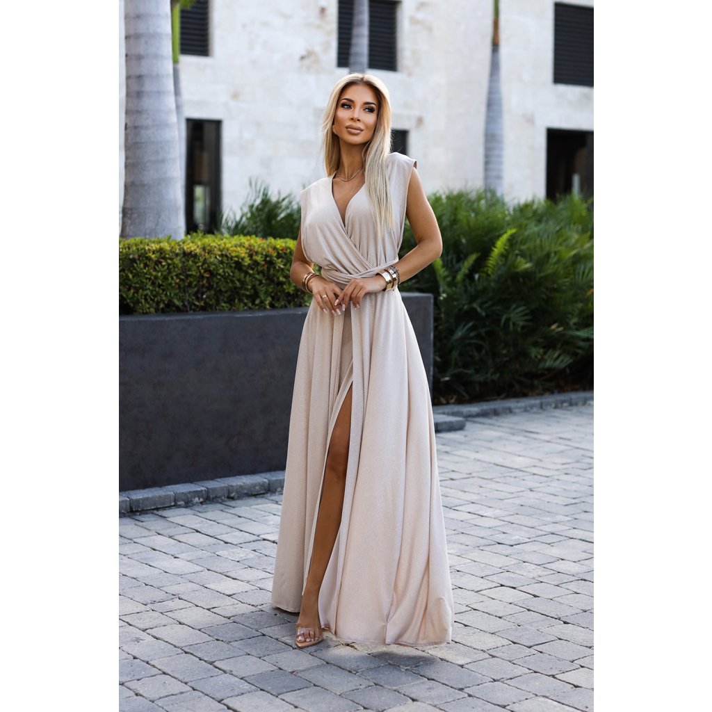 Elegantní dlouhé maxi šaty, které se dají zavázat na mnoho způsobů. Vyrobeno z béžového elastického materiálu se třpytkami. Polská výroba. Značka Numoco.