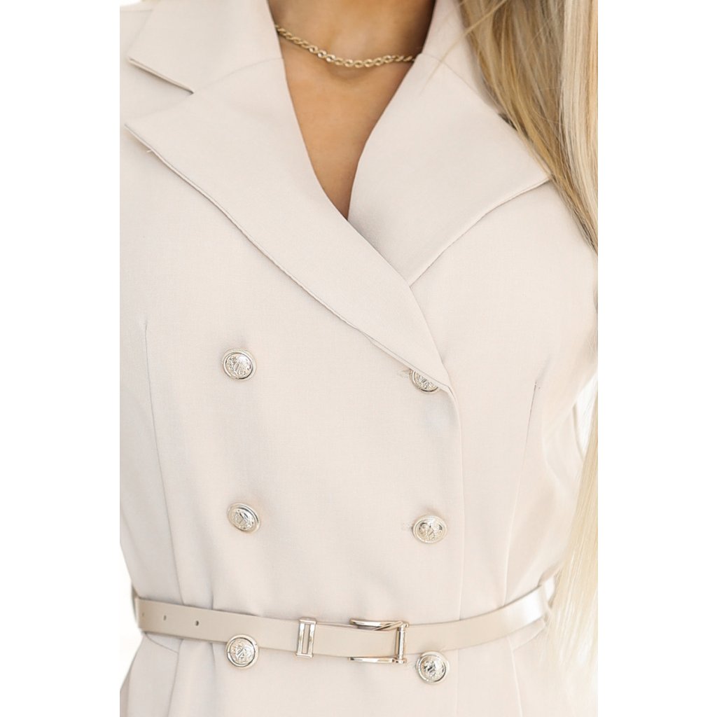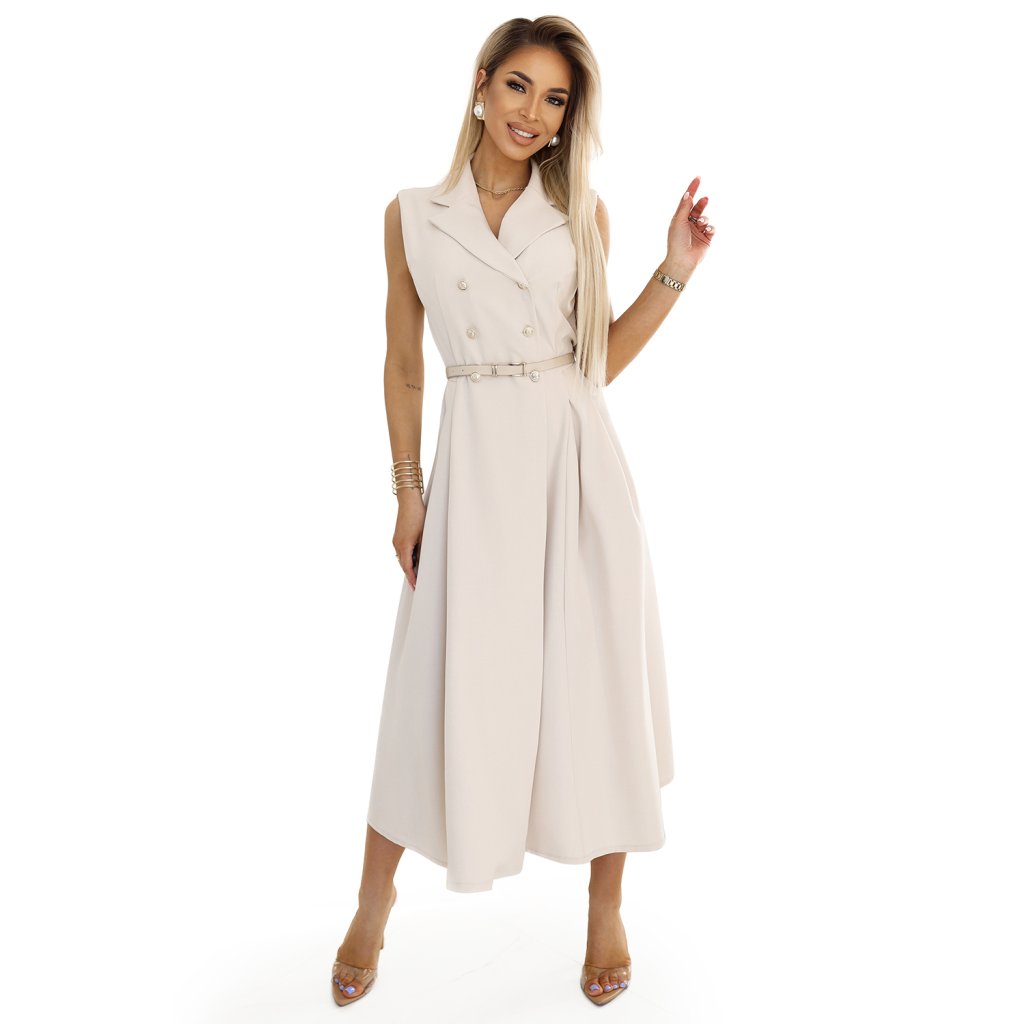 Elegantní midi košilové šaty se zlatými knoflíky a páskem - béžové 596-1