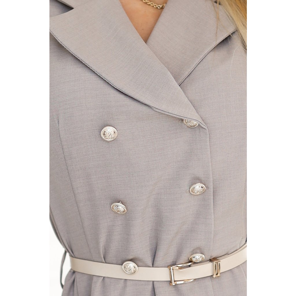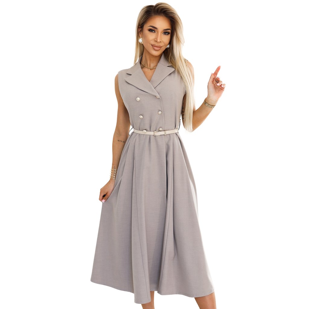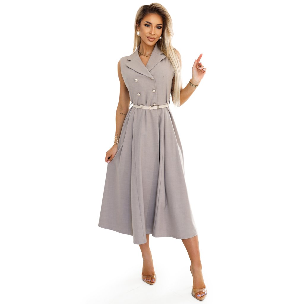 Elegantní midi košilové šaty se zlatými knoflíky a páskem - šedobéžová 596-2