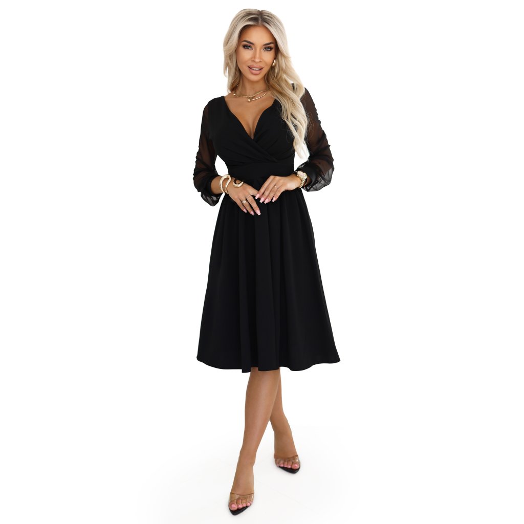 Elegantní černé midi šaty se zavinovacím výstřihem a tylovými rukávy - klasika, která okouzluje