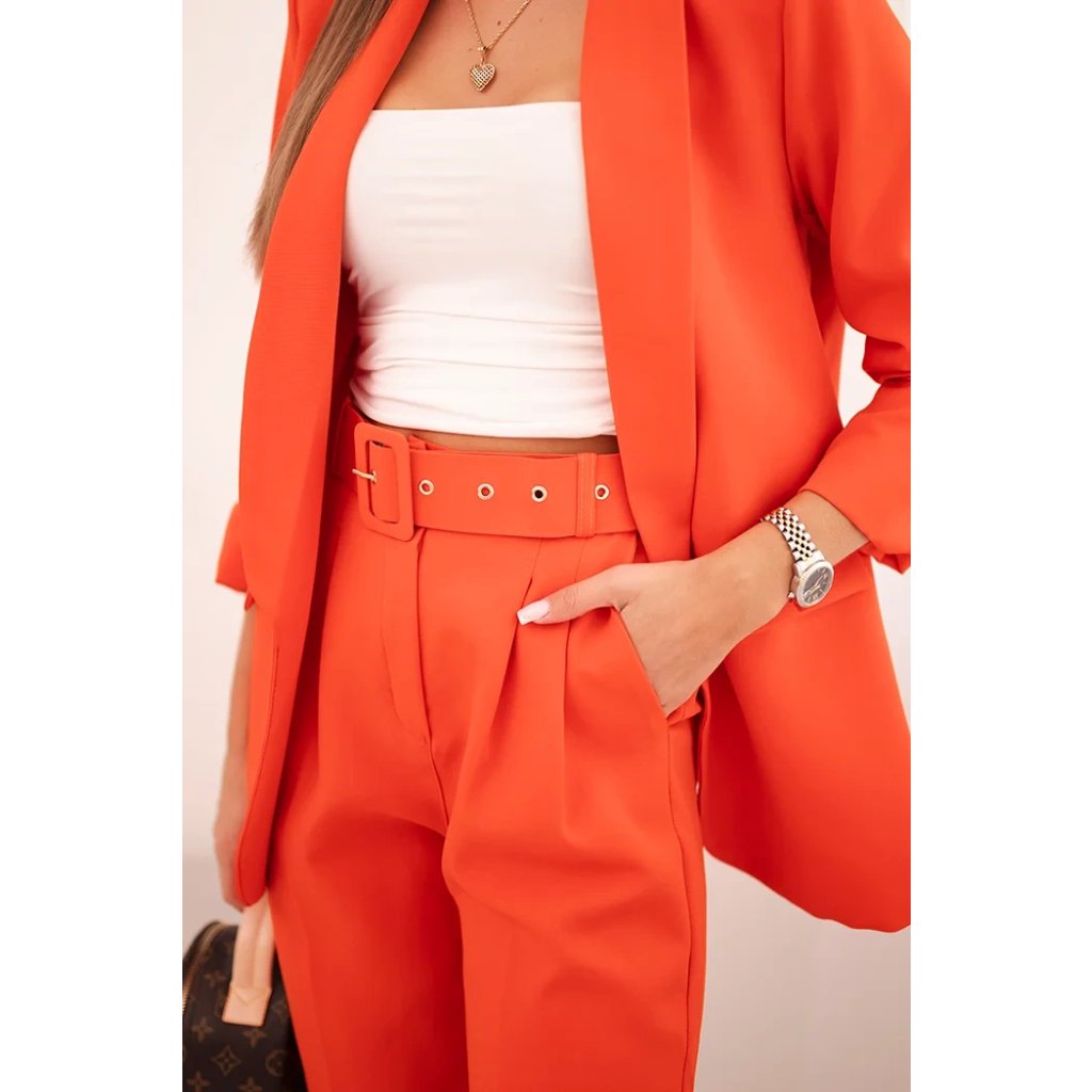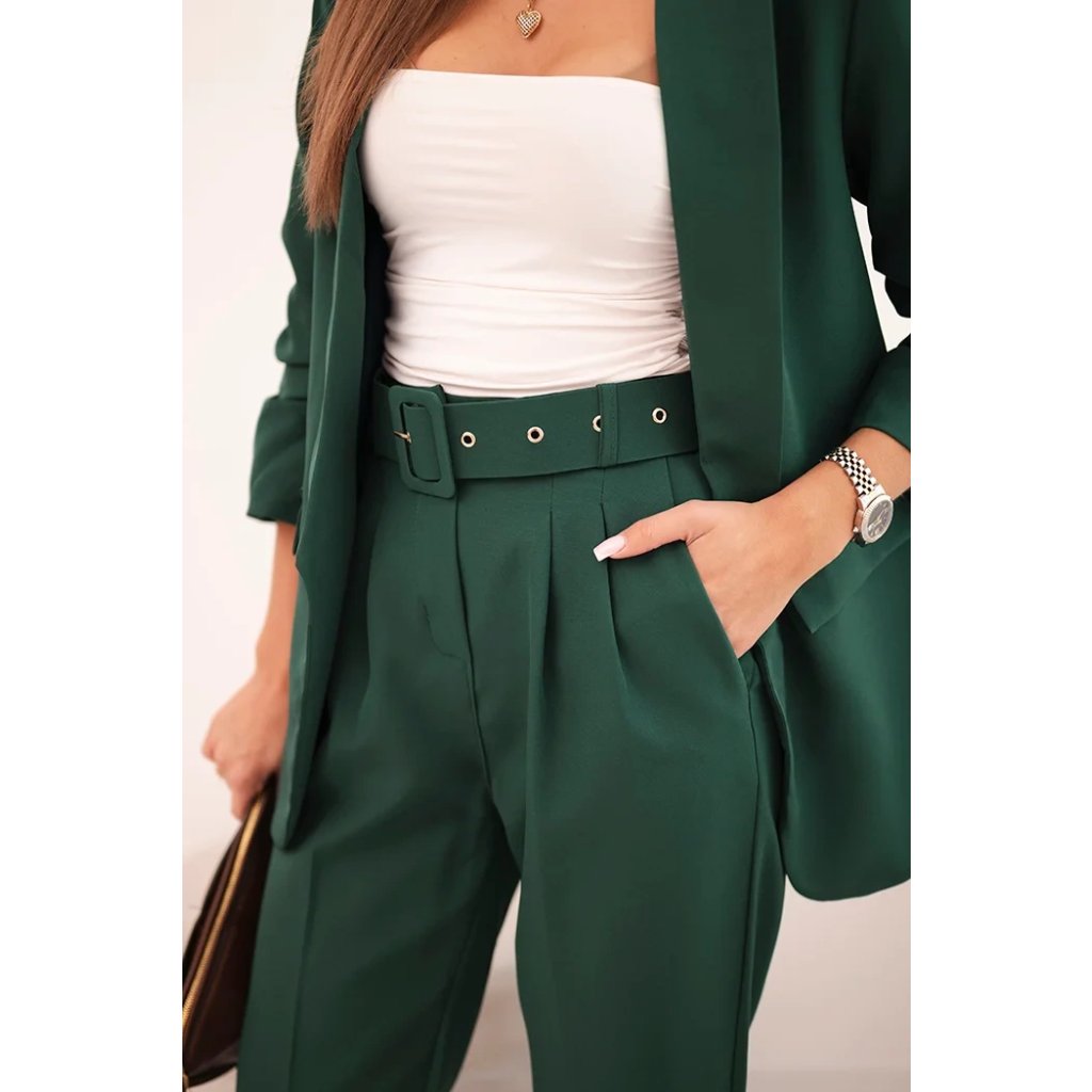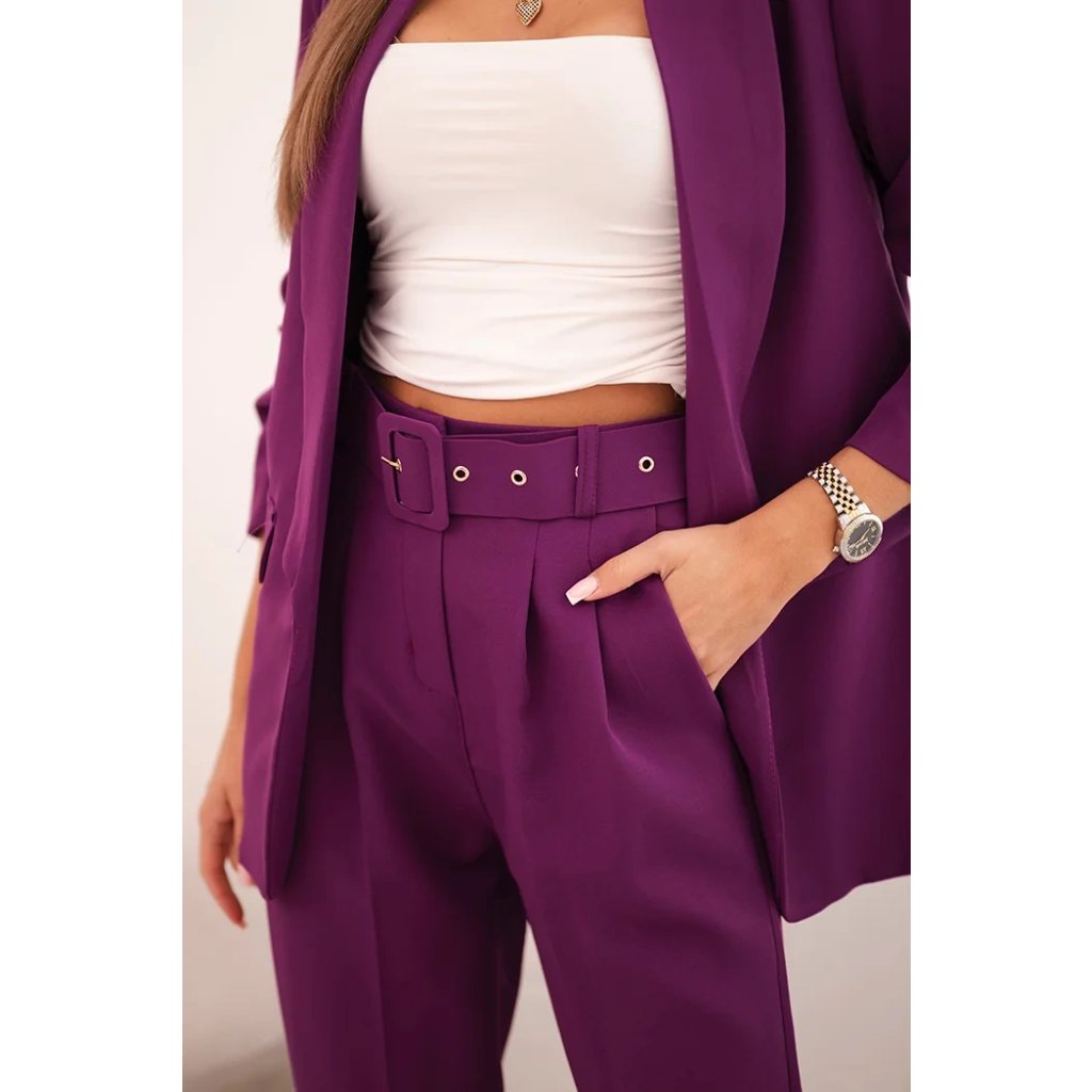 Představujeme vám elegantní sadu saka a kalhot. Bunda bez knoflíků s předními klopami. Bunda má podšívku. Kalhoty s kapsami a páskem. Pružný pásek všitý do pasu kalhot na zadní straně. Velmi módní a stylová sada. Sada je vyrobena z vysoce kvalitního materiálu. Velikost je univerzální a vyhovuje dámám velikosti S, M nebo L.