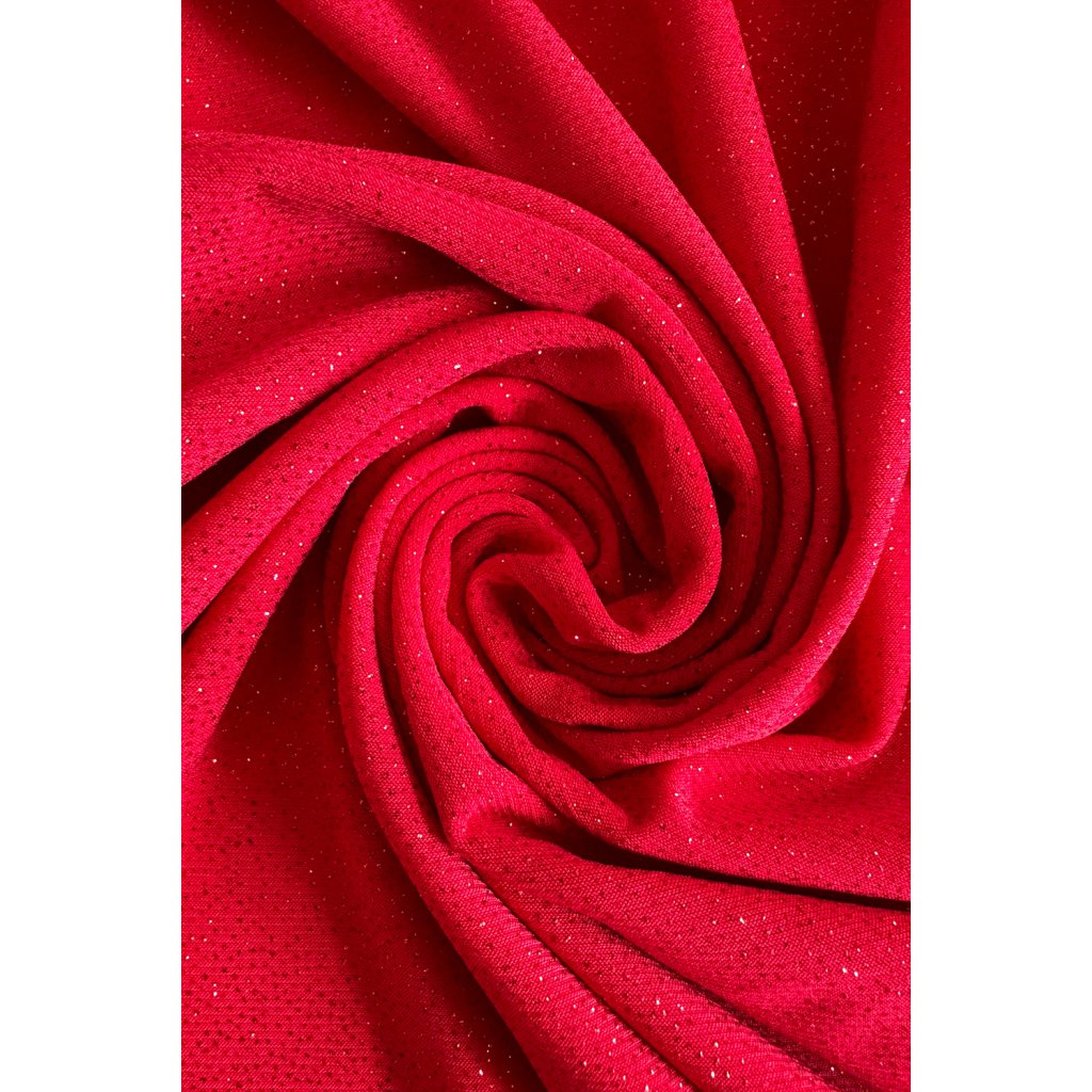 Eleonora - klasické vypasované šaty s výřezem na zádech. Vyrobeno z elastického červeného materiálu se třpytkami. Značka numoco. Polská výroba.