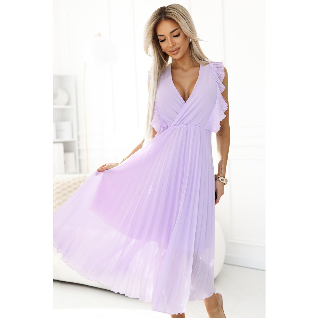 Emily – limitovaná edice! Plisované šifonové midi šaty s véčkovým výstřihem a volány. Lehké, vzdušné a ženské, ideální pro zvláštní příležitosti. Vřesová barva. Polský výrobek. Značka Numoco. ✨ LIMITOVANÁ EDICE ✨
