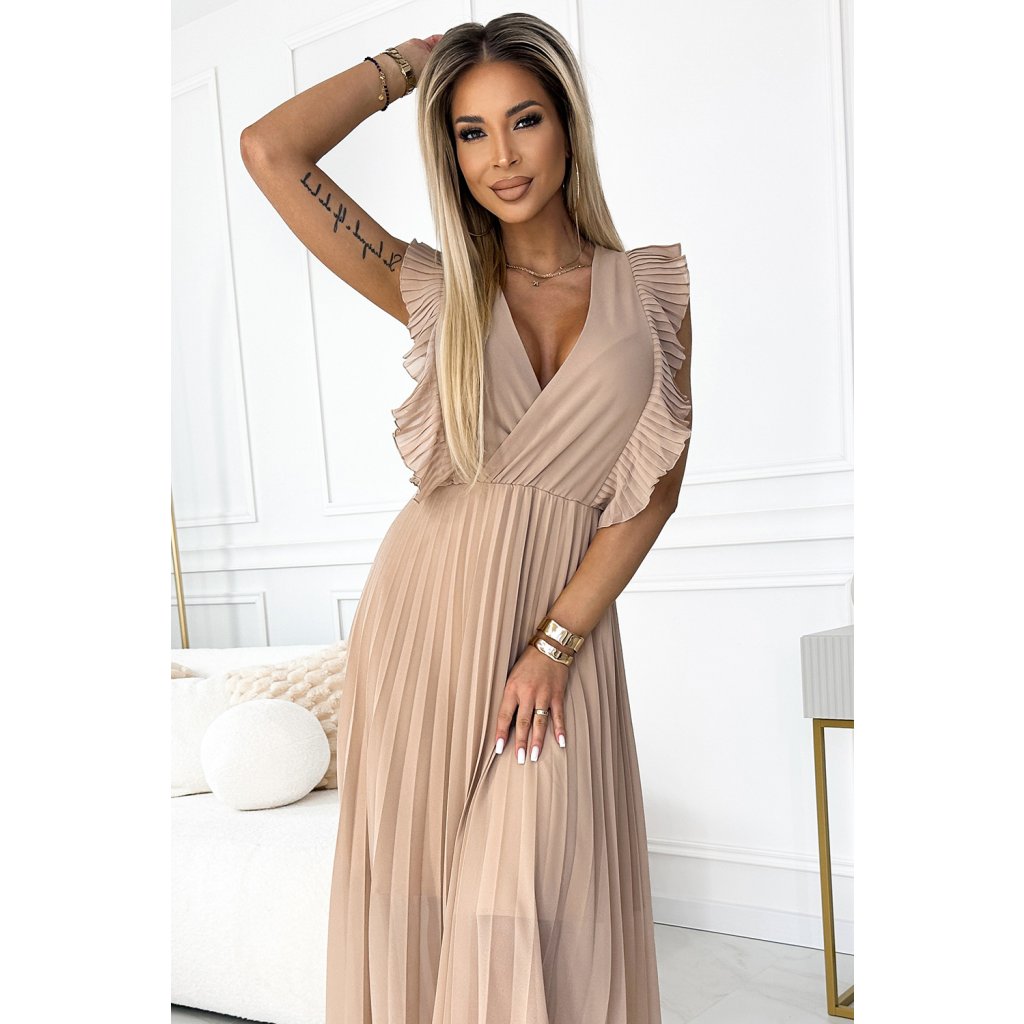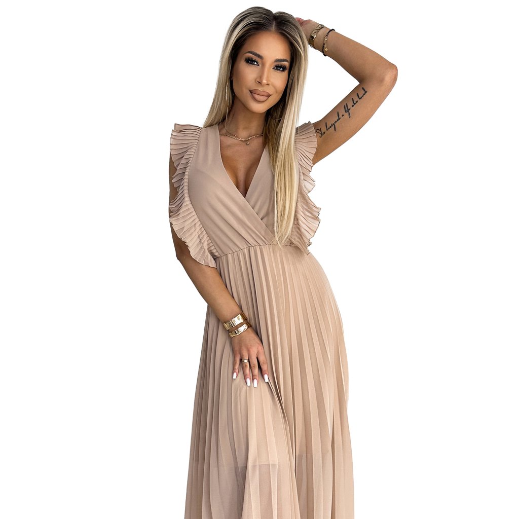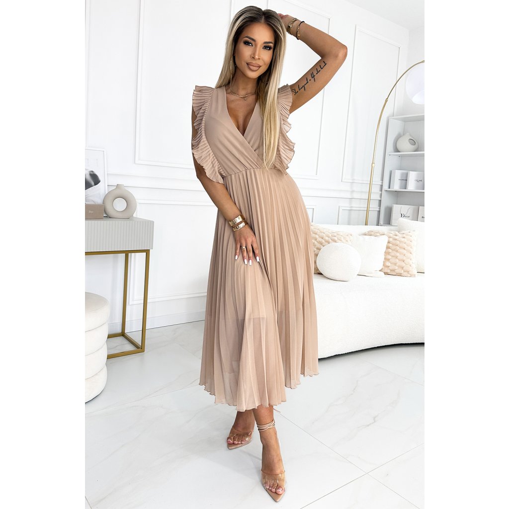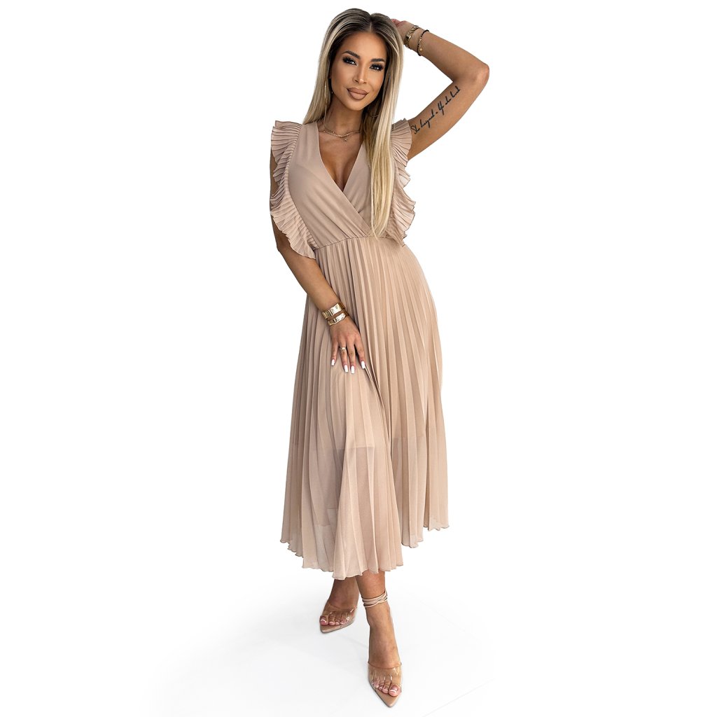 Emily - skládané šifónové šaty s výstřihem a volánkami. Sukně byla šitá v módní 7/8 délce. Připíná se vzadu zakrytým zipem. Béžová barva. Numoco. Polská produkce.