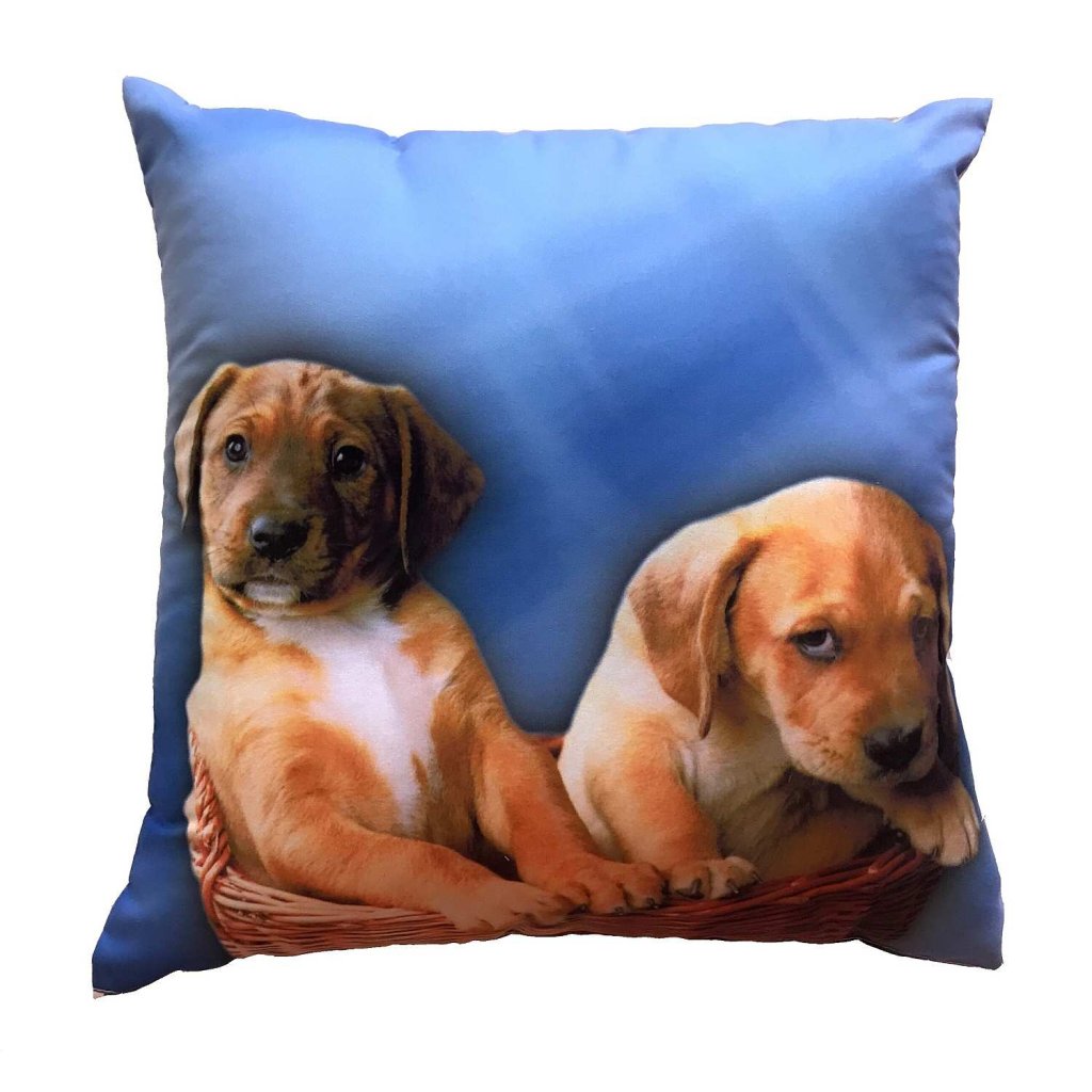 Roztomilý polštářek s fototiskem dvou štěňat sedících v proutěném košíku na modrém pozadí. Jedno štěně má světle hnědou srst s bílými znaky, druhé je tmavší a opírá si hlavičku o okraj košíku. Ideální dekorace pro milovníky pejsků.