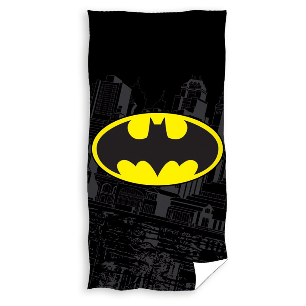 Přímo uprostřed černé osušky je velké, žluté logo s černým netopýrem