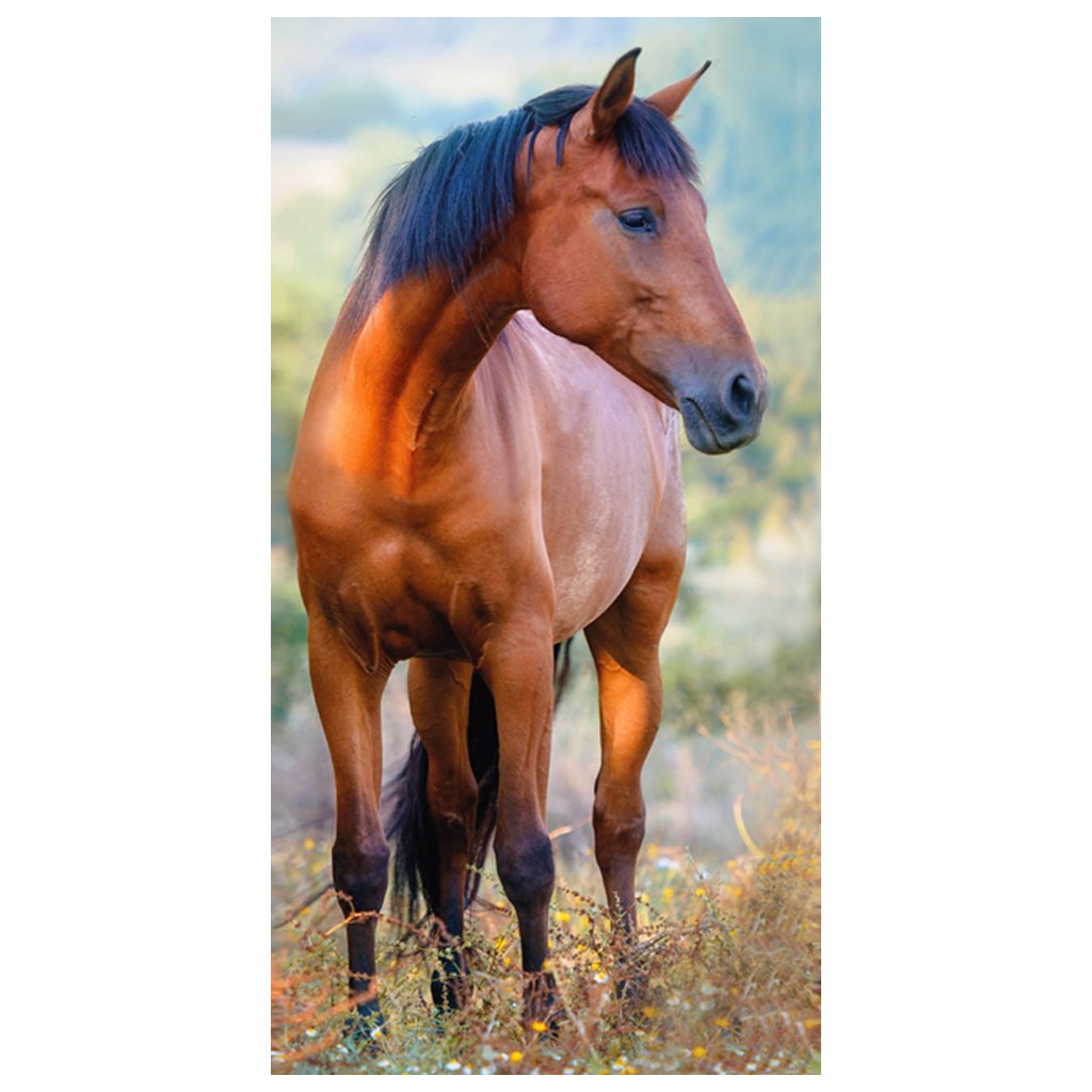 Froté ručník Kůň Hnědák na Louce, je vyrobený ze 100% bavlny a jeho rozměry jsou 30x50 cm, s gramáží 330 g/m²