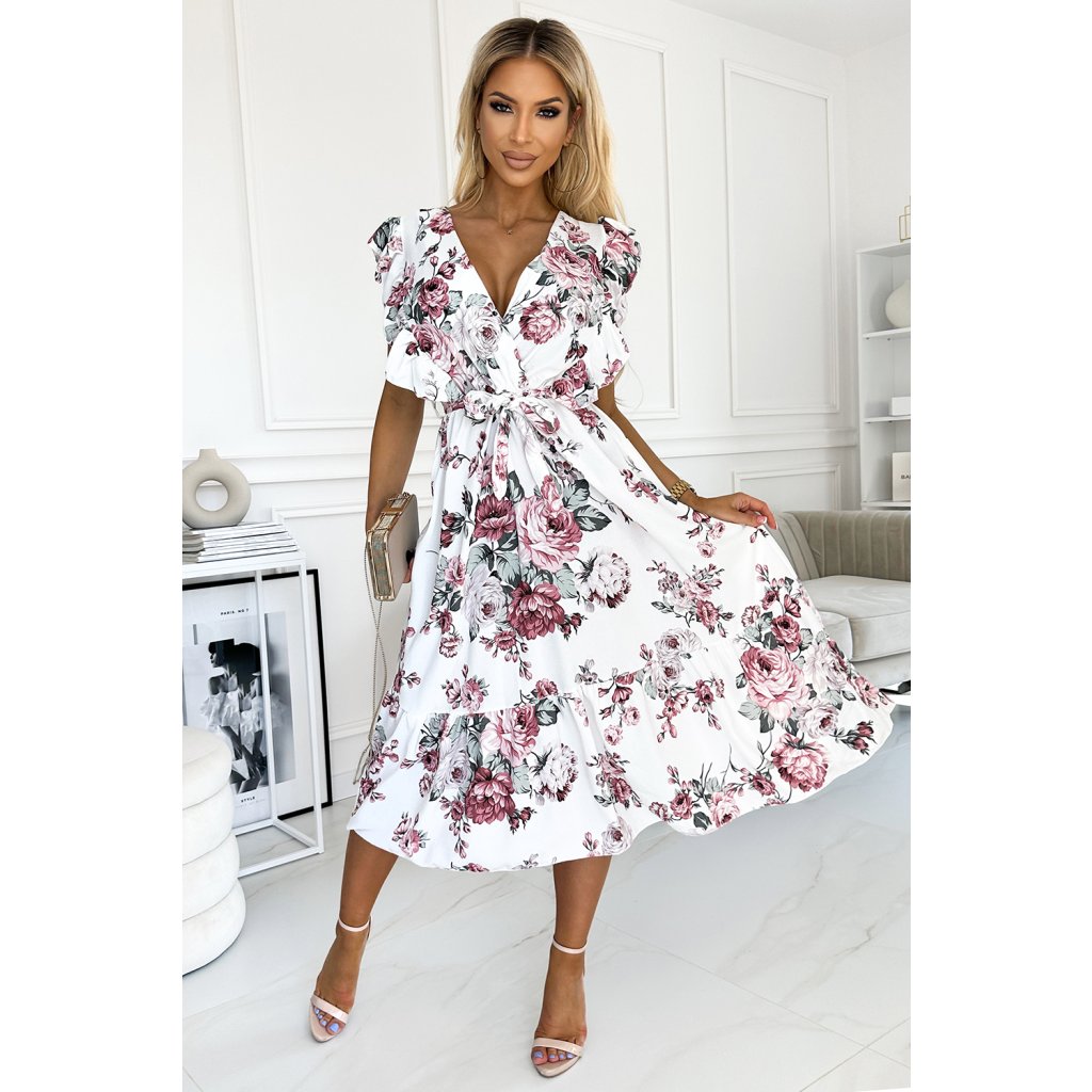 GABRIELLA - šaty s psaníčkovým výstřihem, řasením na ramenou a zavazováním v pase. Vzor: bílá s kaštanovými růžemi. Značka Numoco. Evropská produkce.