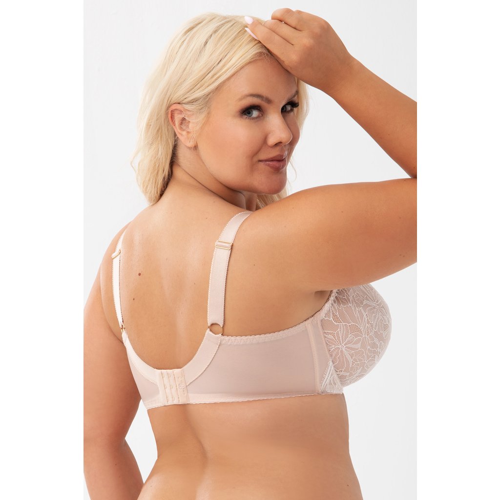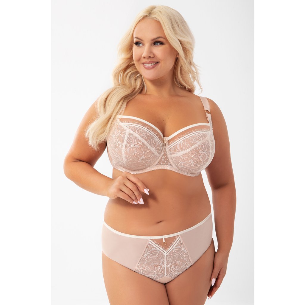 Biustonosz marki Gorsenia. Model K904 Mirella. Posiada druty, które podpierają piersi odpowiednio je kształtując. Fiszbiny pionowe osadzone na bokach. Produkt posiada regulowane ramiączka bez możliwości ich odpięcia. Haczyki do ramiączek metalowe. Biustonosz zapinany na haftki. Miejsce zapięcia: tył. Produkt został wykonany z 90% poliamid, 7% elastan, 3% poliester. Produkt damski.