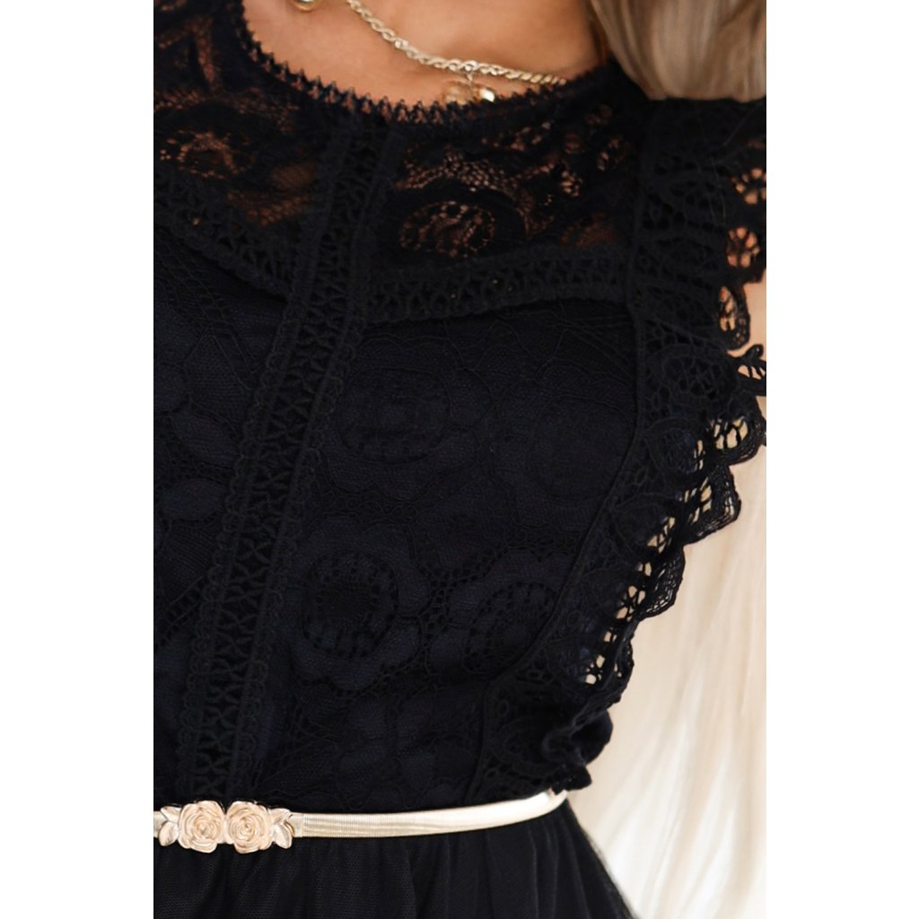 Černé krajkové šaty s tylovým spodním dílem a ozdobným páskem. Ženské, elegantní a ideální pro zvláštní příležitosti. Numoco Basic.