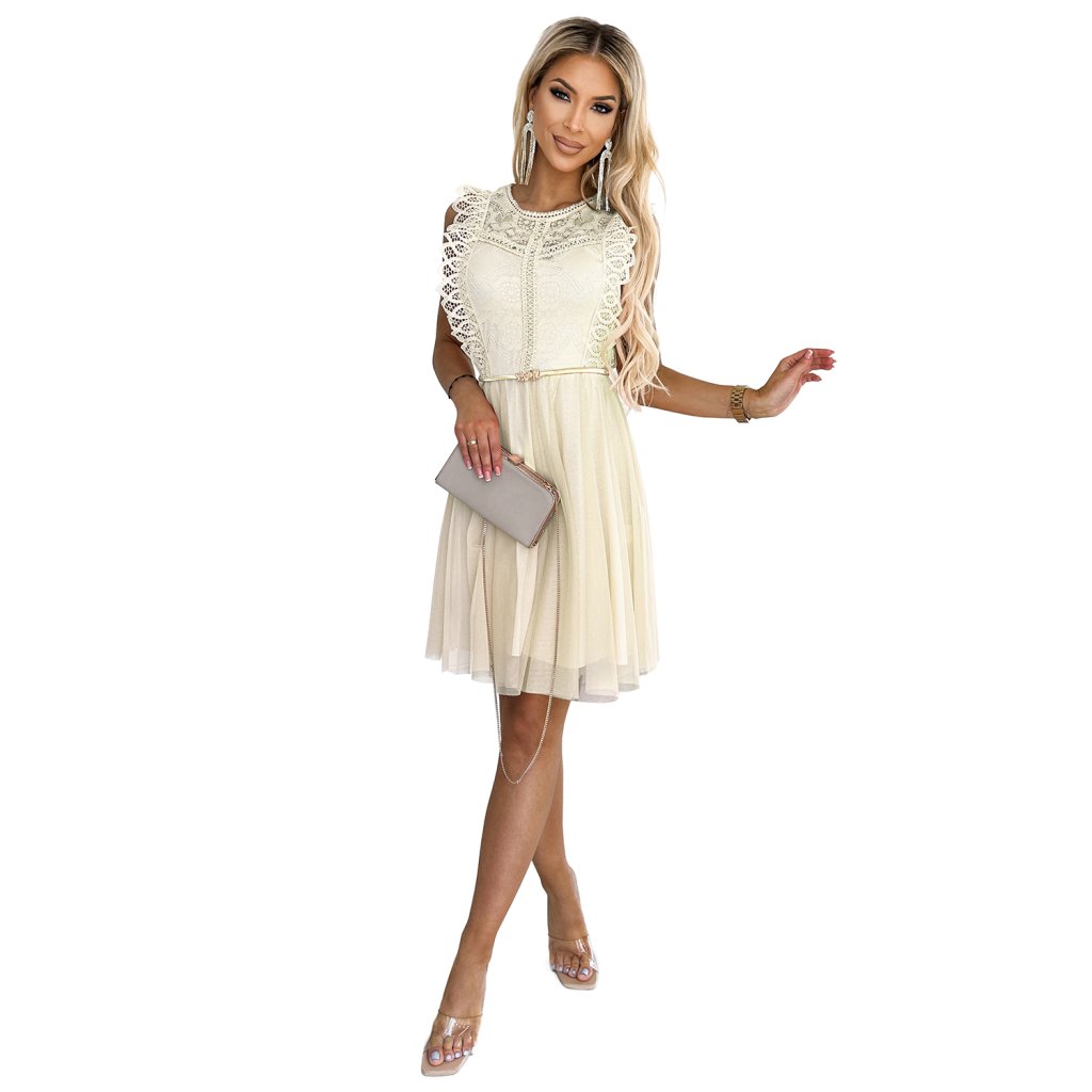 GRETA - šaty s krajkou, tylová sukně a zlatý pásek. Béžová barva. Značka Numoco. evropská produkce.