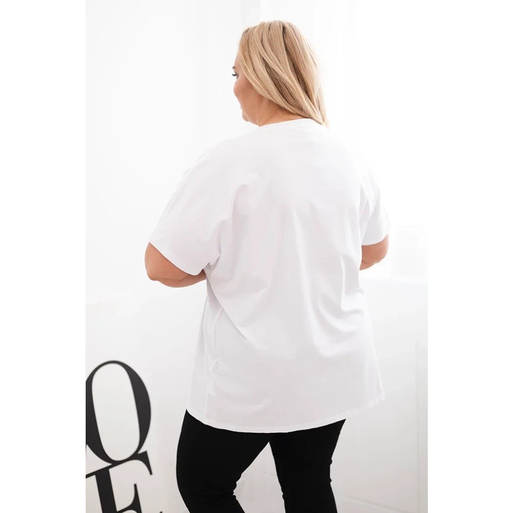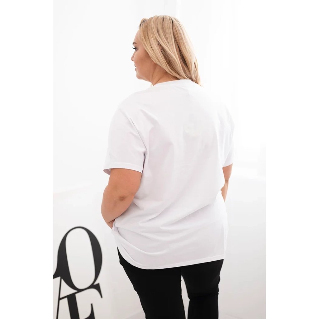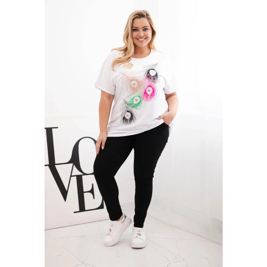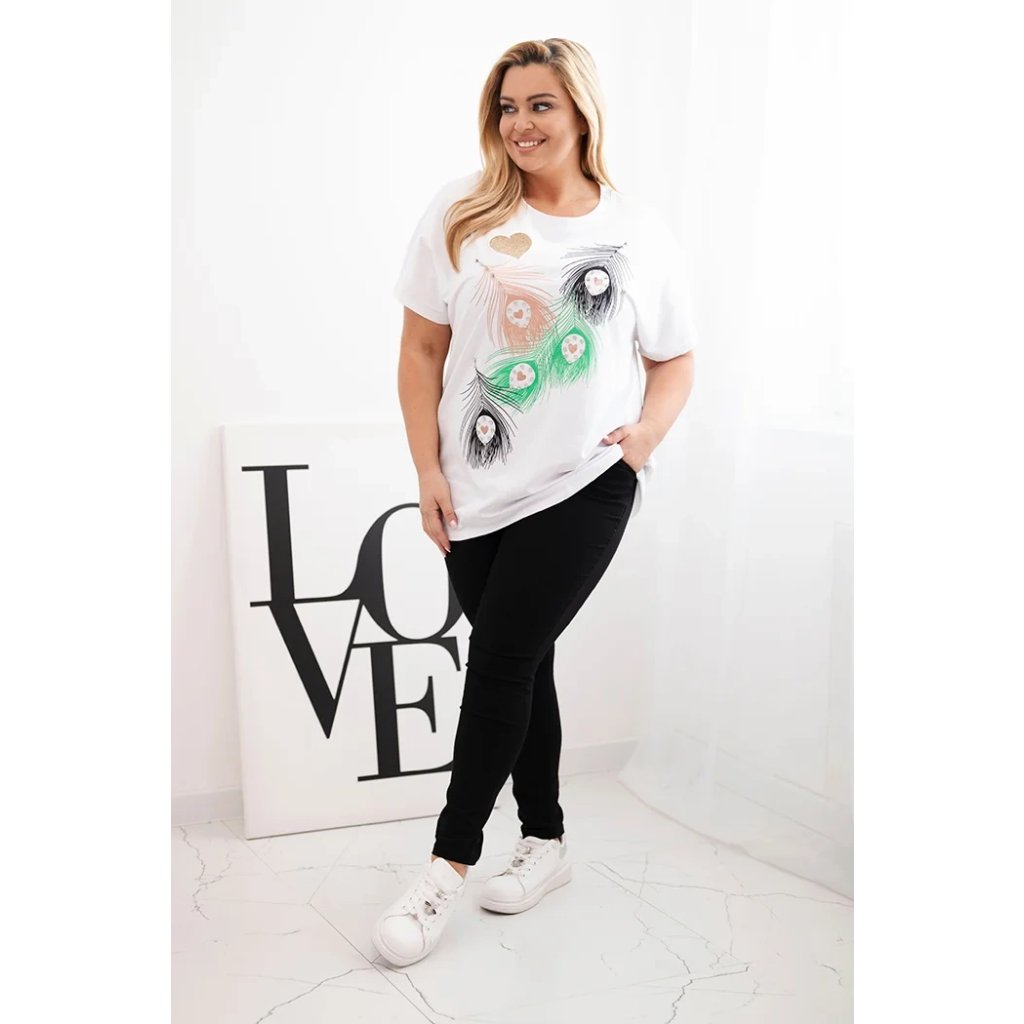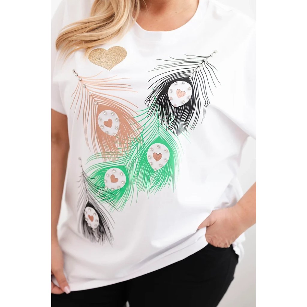 Dámská halenka s krátkým rukávem a ozdobným motivem peří je ideální volbou pro každé roční období. Její volný střih zajišťuje pohodlné nošení a poutavý potisk s lesklými prvky dodává outfitu jedinečný charakter. Skvělá jak pro každodenní nošení, tak pro neformální příležitosti. Díky jemné bavlně s příměsí elastanu je materiál prodyšný a elastický, přizpůsobí se postavě bez nepříjemného tlaku. Dekorativní peří a třpytivá srdíčka jí dodávají ženský půvab, který jistě upoutá pozornost.