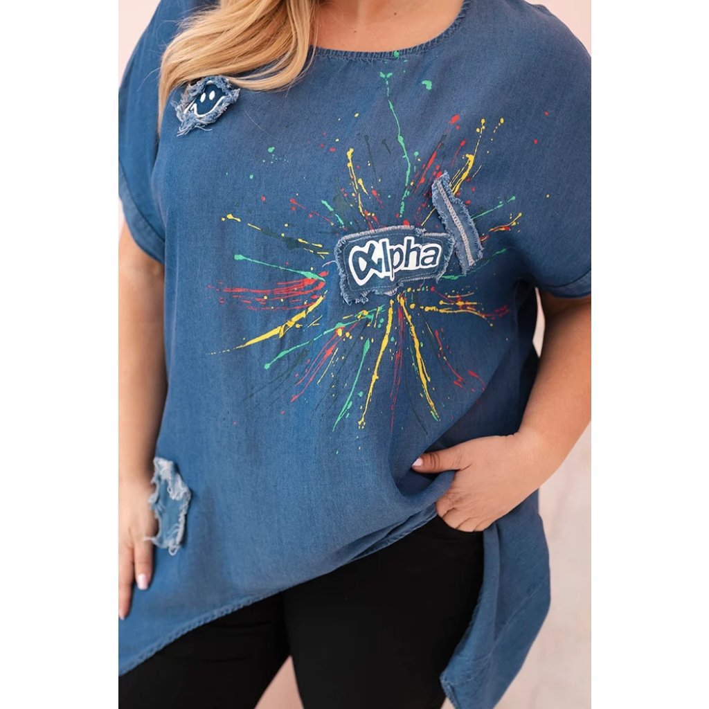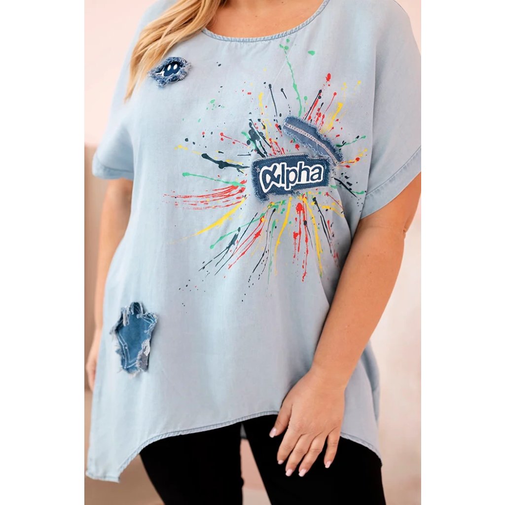 Pokud máš ráda originální styl a pohodlí každý den, tato dámská halenka s krátkým rukávem a výraznými nášivkami tě určitě zaujme. Model je vyroben z měkkého, prodyšného lyocellu, který zajišťuje pohodlí i během horkých dnů. Umělecké potisky připomínající barevné záblesky a módní nášivka „Alpha“ jí dodávají jedinečný charakter. Asymetrický spodní lem – kratší vpředu a delší vzadu – opticky zeštíhluje postavu a skvěle sedí na každé postavě. Jemné oděrky a ozdobné aplikace vytvářejí efekt ležérního městského stylu, který se perfektně hodí na procházky, nákupy nebo neformální setkání s přáteli.