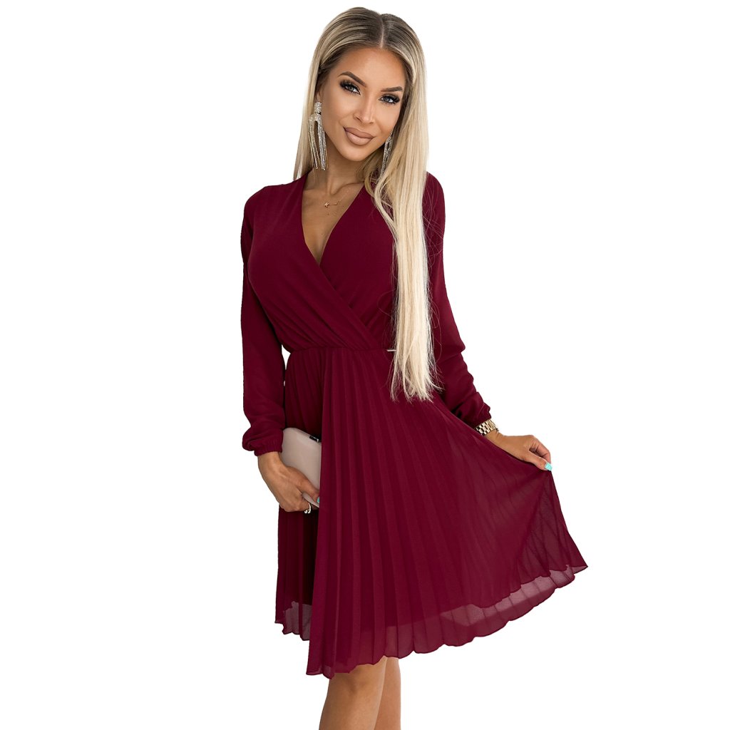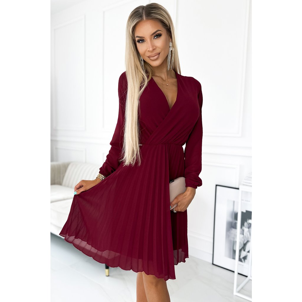 Isabella - plisované šifon šaty s výstřihem a dlouhým rukávem. Vínová barva. Značka Numoco. Polská produkce.