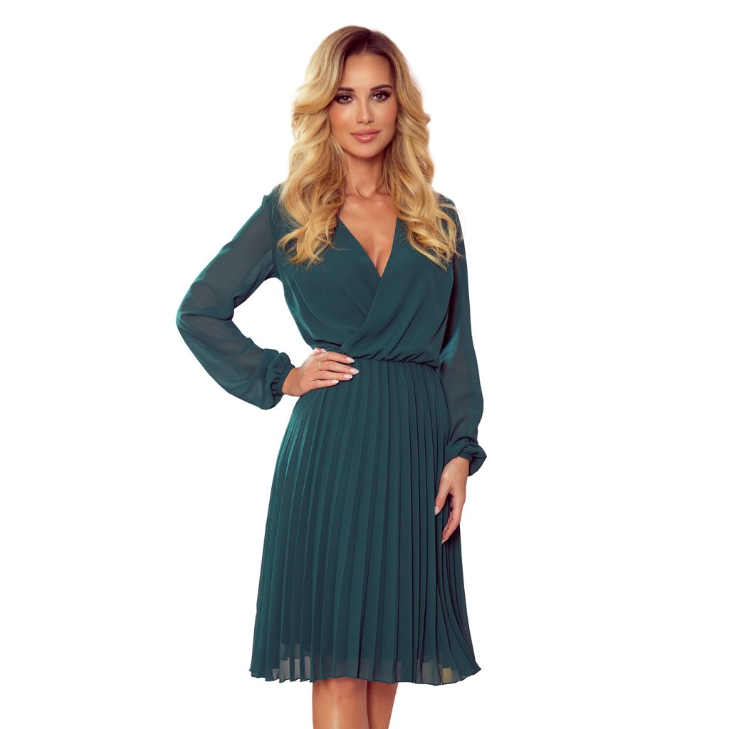 Isabella - plisované šifon šaty s výstřihem a dlouhým rukávem. Zelená barva. Značka Numoco. Polská produkce.