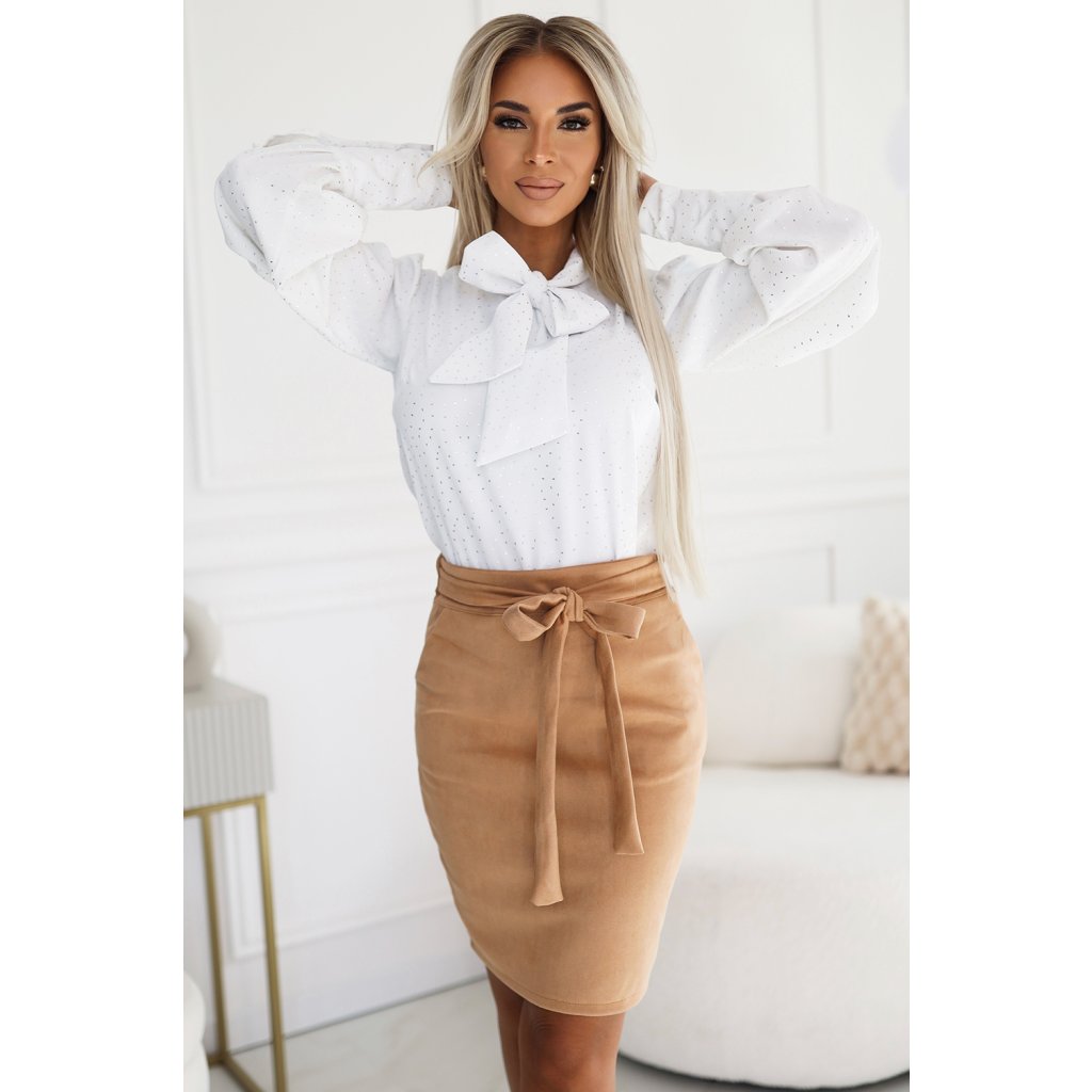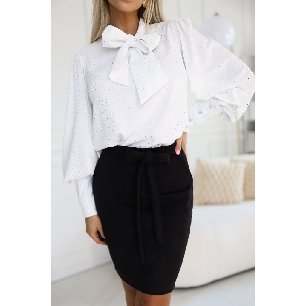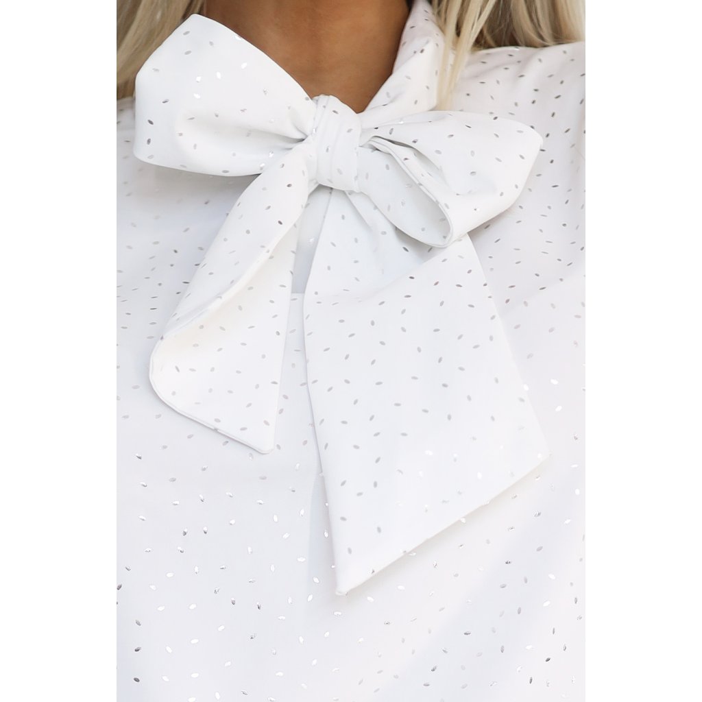 Jedinečná business halenka s dlouhým rukávem, zavazováním a knoflíky - bílá se stříbrným vzorem 578-2