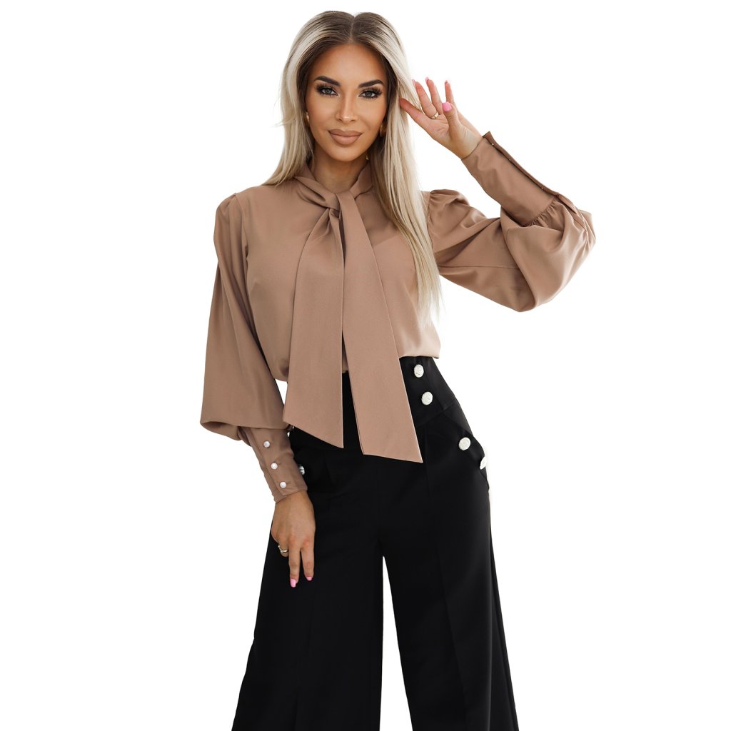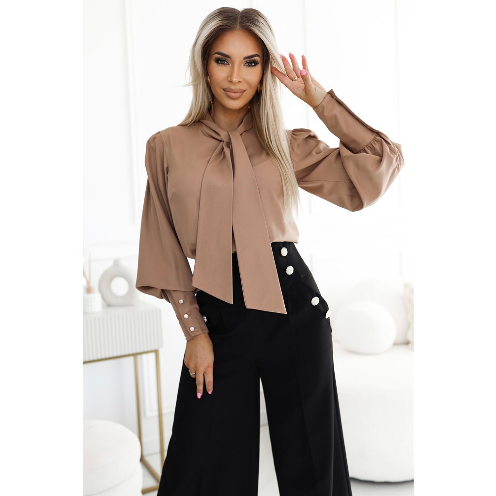 Jedinečná business halenka s dlouhým rukávem, zavazováním a knoflíky - karamelová barva - mocha mousse 578-1