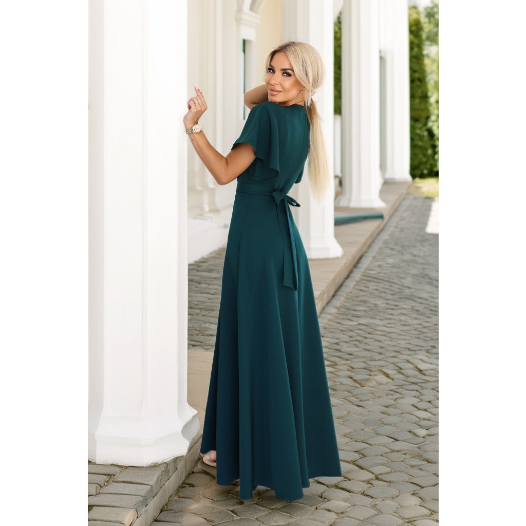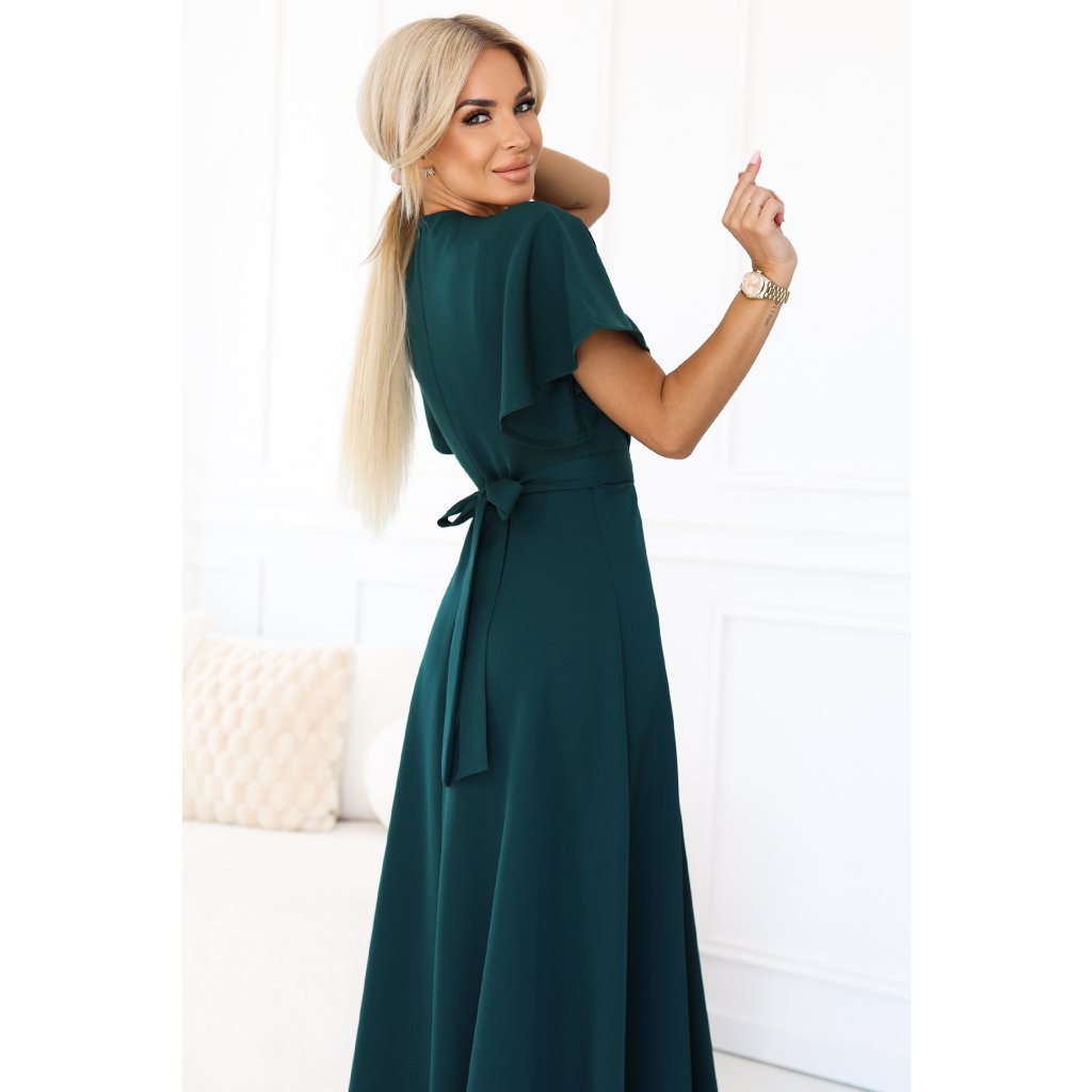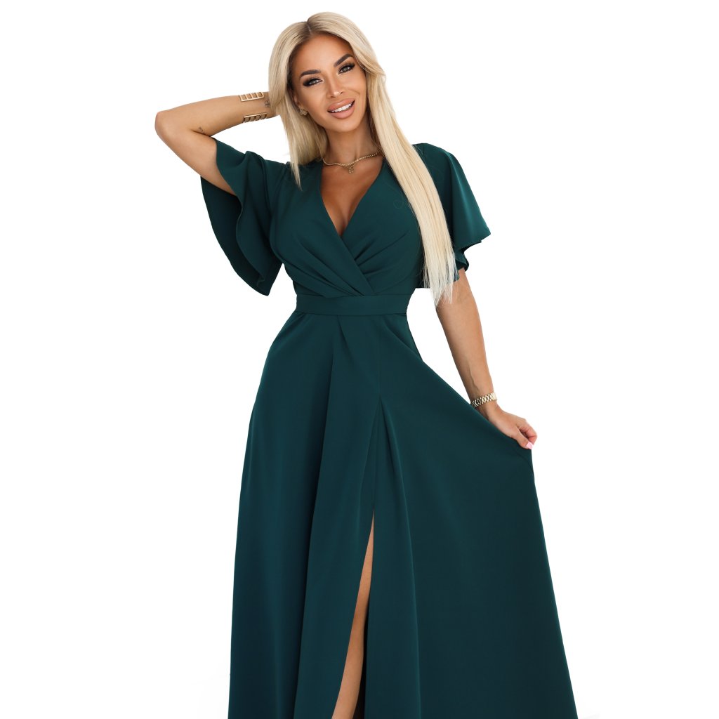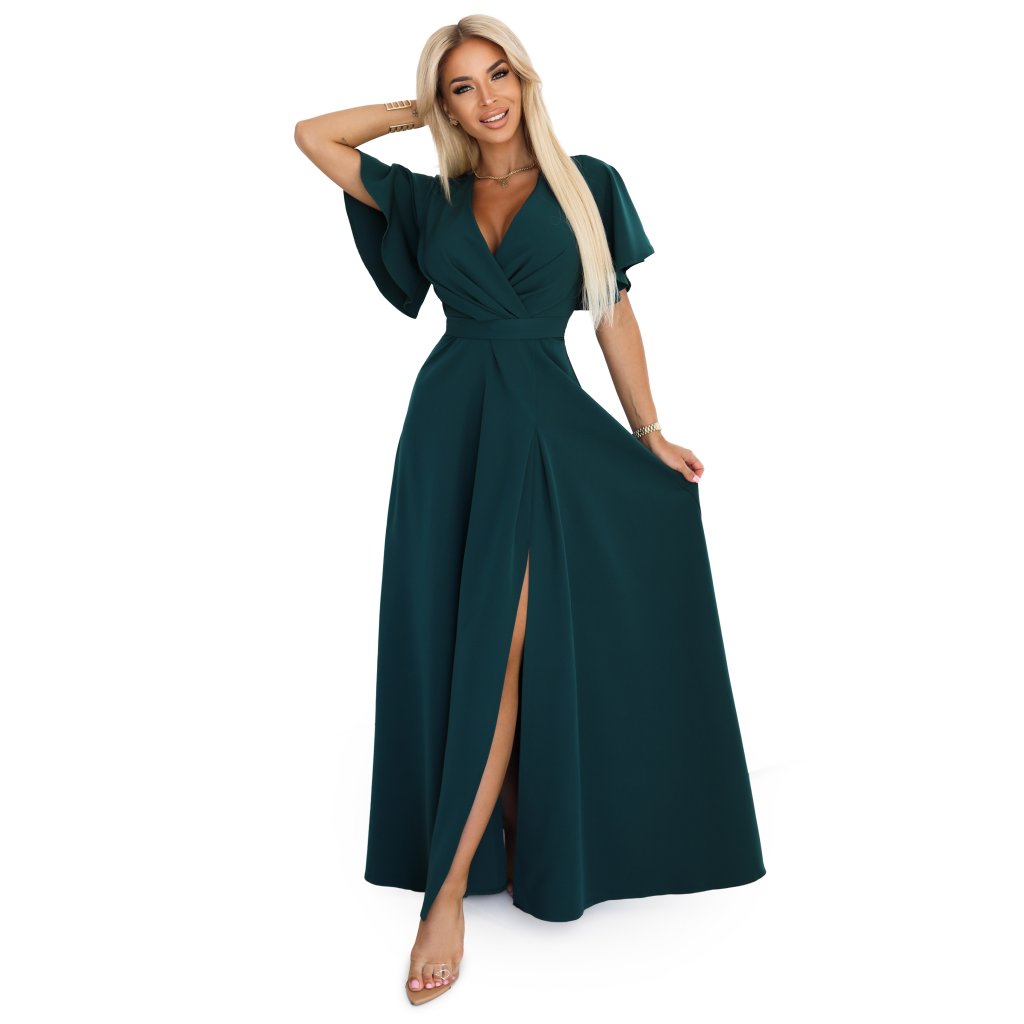Jennifer – dlouhé, lahvově zelené maxi šaty s zavinovacím výstřihem, volnými rukávy a vysokým rozparkem na nohavici. Vyrobeno v Polsku, značka Numoco.