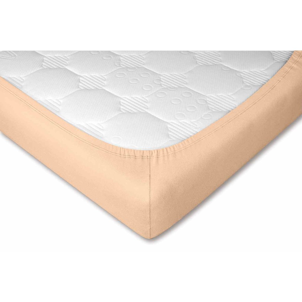 Napínací jersey prostěradlo v medové barvě je ušito z kvalitní směsi 95 % česané bavlny a 5 % elastanu. Tato kombinace zajišťuje vysokou pružnost, rozměrovou stálost a dokonalé přilnutí k matraci. Hladký jersey materiál je příjemný na dotek a ideální pro celoroční použití.