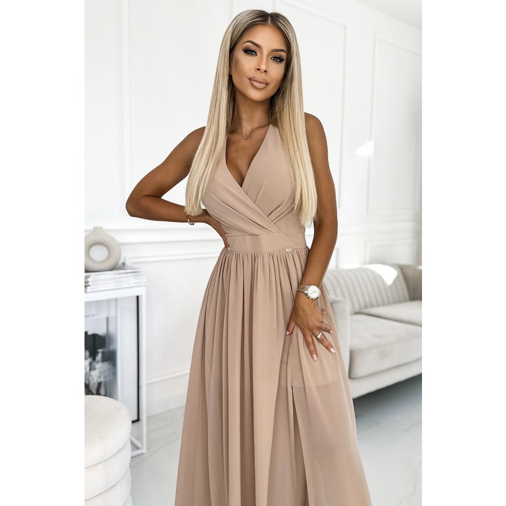 Justine - dlouhé šaty s výstřihem, rozparkem na nohavici a zavazováním na zádech. Ze vzdušného materiálu ve béžové barvě. Zapínání vzadu na krytý zip. Polský výrobek. Značka Numoco.