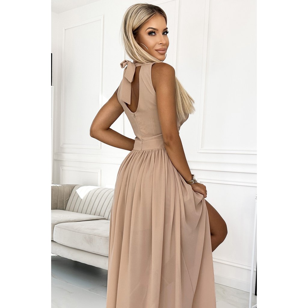 JUSTINE Dlouhé šaty s výstřihem a zavazováním - béžové 362-6 - výprodej