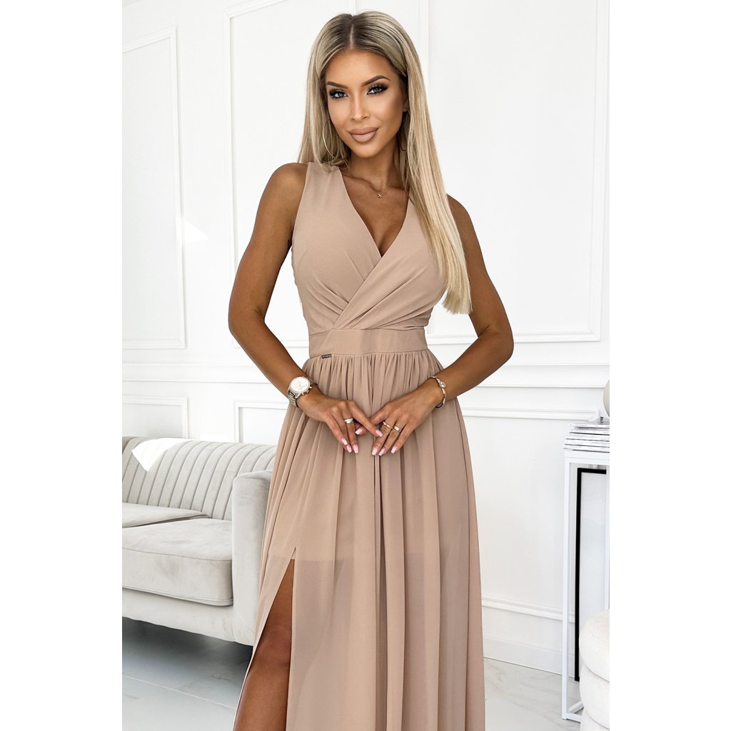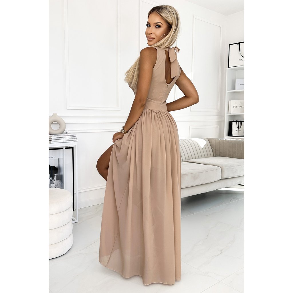 Justine - dlouhé šaty s výstřihem, rozparkem na nohavici a zavazováním na zádech. Ze vzdušného materiálu ve béžové barvě. Zapínání vzadu na krytý zip. Polský výrobek. Značka Numoco.