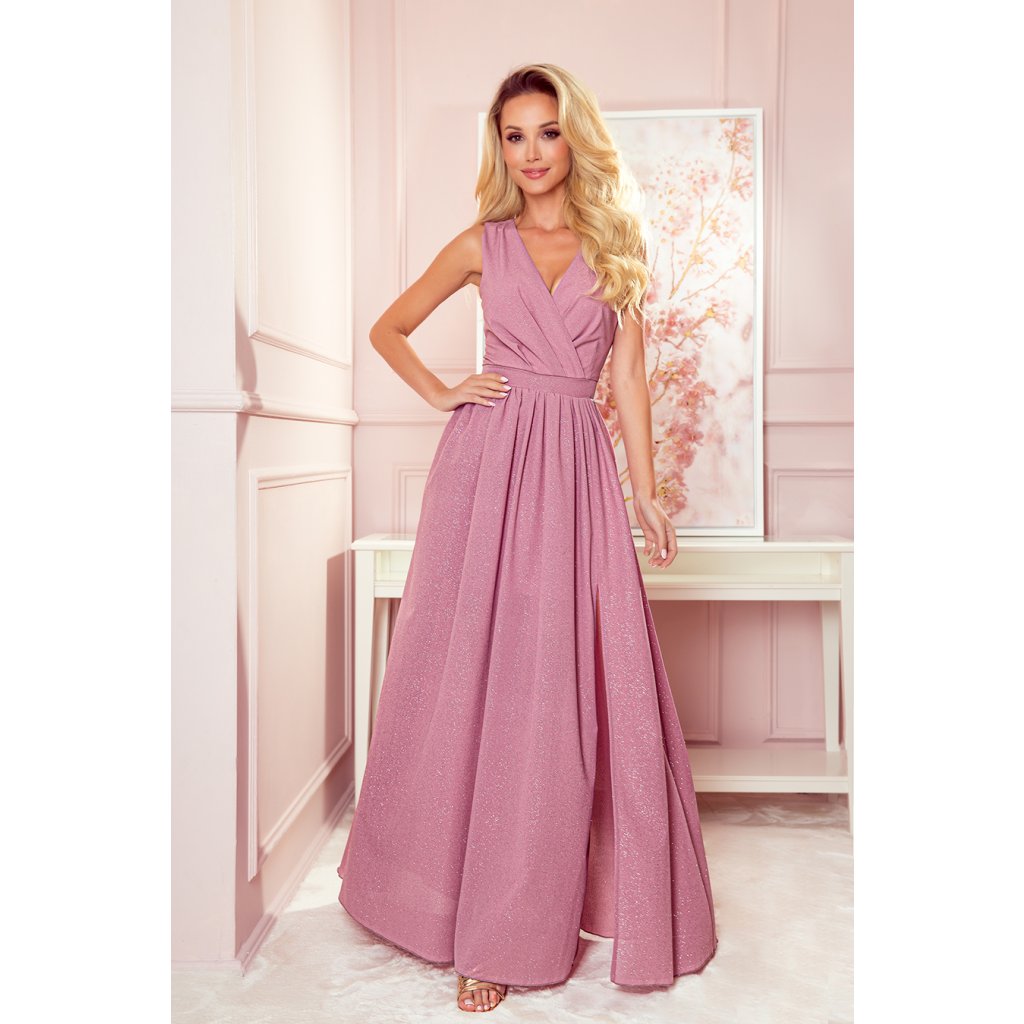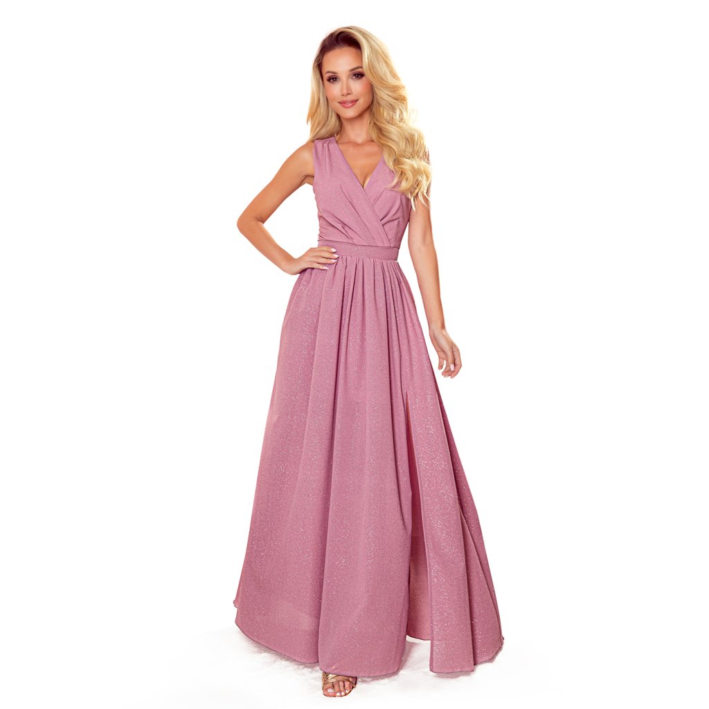 Justine - dlouhé šaty s výstřihem, rozparkem na nohavici a zavazováním na zádech. Ze vzdušného materiálu v barvě pudrově růžové se třpytkami. Zapínání vzadu na krytý zip. Polský výrobek. Značka Numoco.