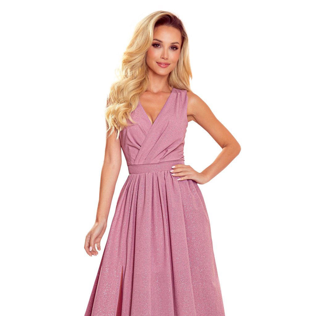 JUSTINE Dlouhé šaty s výstřihem a zavazováním - pudrově růžové se třpytkami 362-1