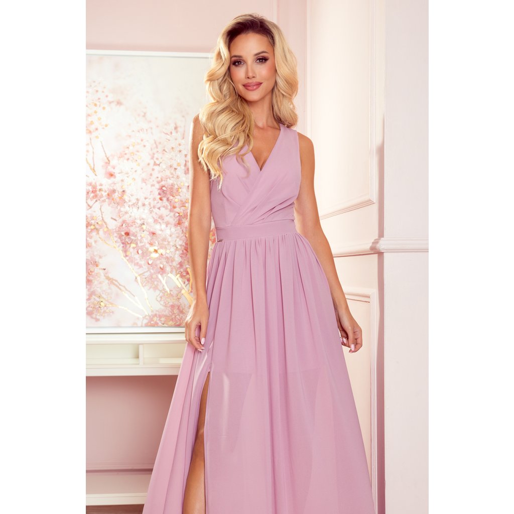 Justine - dlouhé šaty s výstřihem, rozparkem na nohavici a zavazováním na zádech. Vyrobeno ze vzdušného materiálu v pudrově růžové barvě. Zapínání vzadu na krytý zip. Polský výrobek. Značka Numoco.