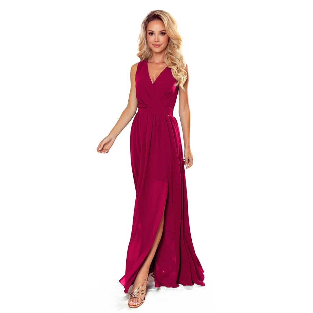 Justine - dlouhé šaty s výstřihem, rozparkem na nohavici a zavazováním na zádech. Ze vzdušného materiálu ve vínové barvě. Zapínání vzadu na krytý zip. Polský výrobek. Značka Numoco.
