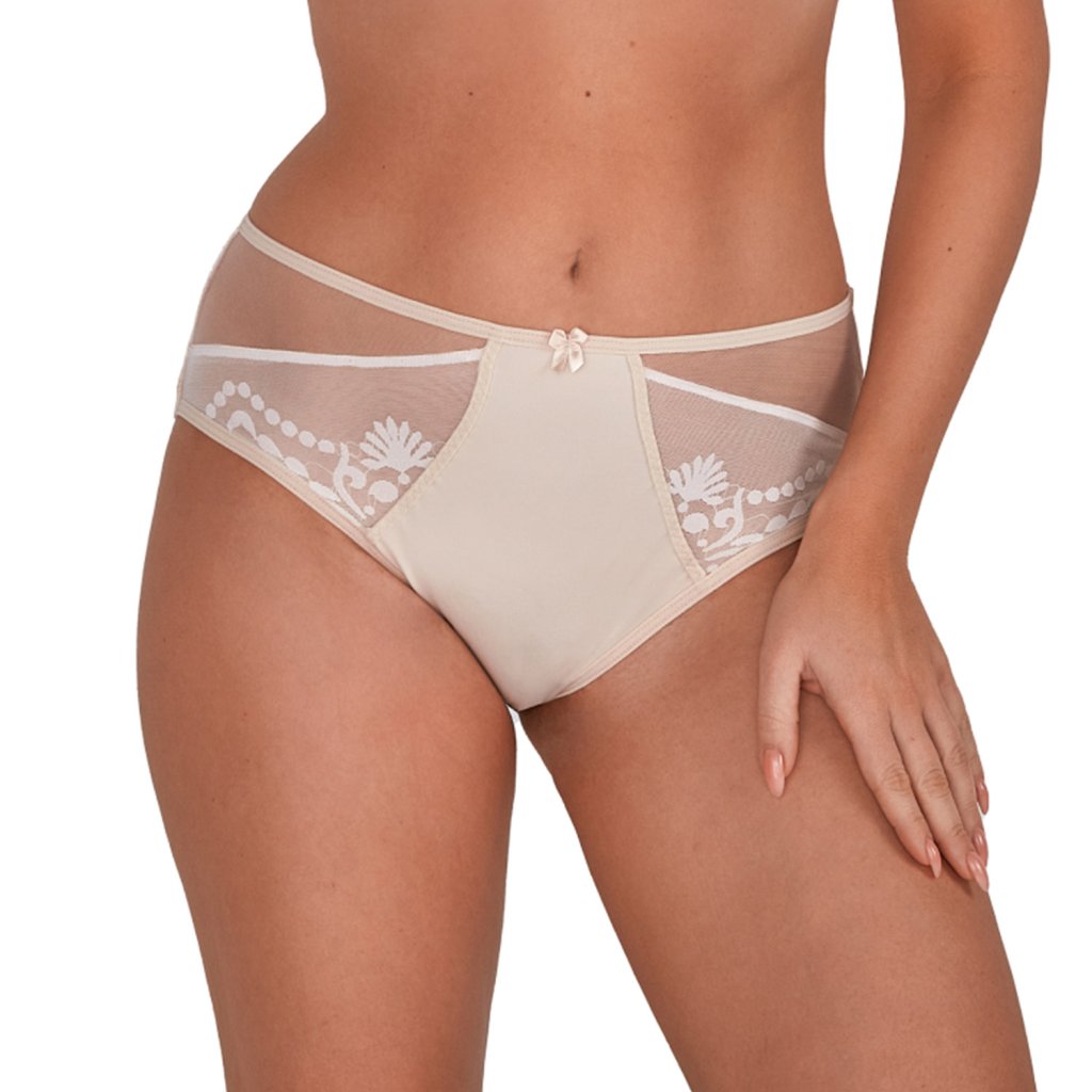 Světle hnědé kalhotky . - plný střih - model s vyšším pasem - jsou vyrobeny z hladké, elastické tkaniny - Krajka a síťované vsadky na přední straně - do kompletu doporučujeme podprsenku 1090 nebo 1091 Složení: 74% polyamid, 16% elastan, 10% bavlna.Doplňkové parametry