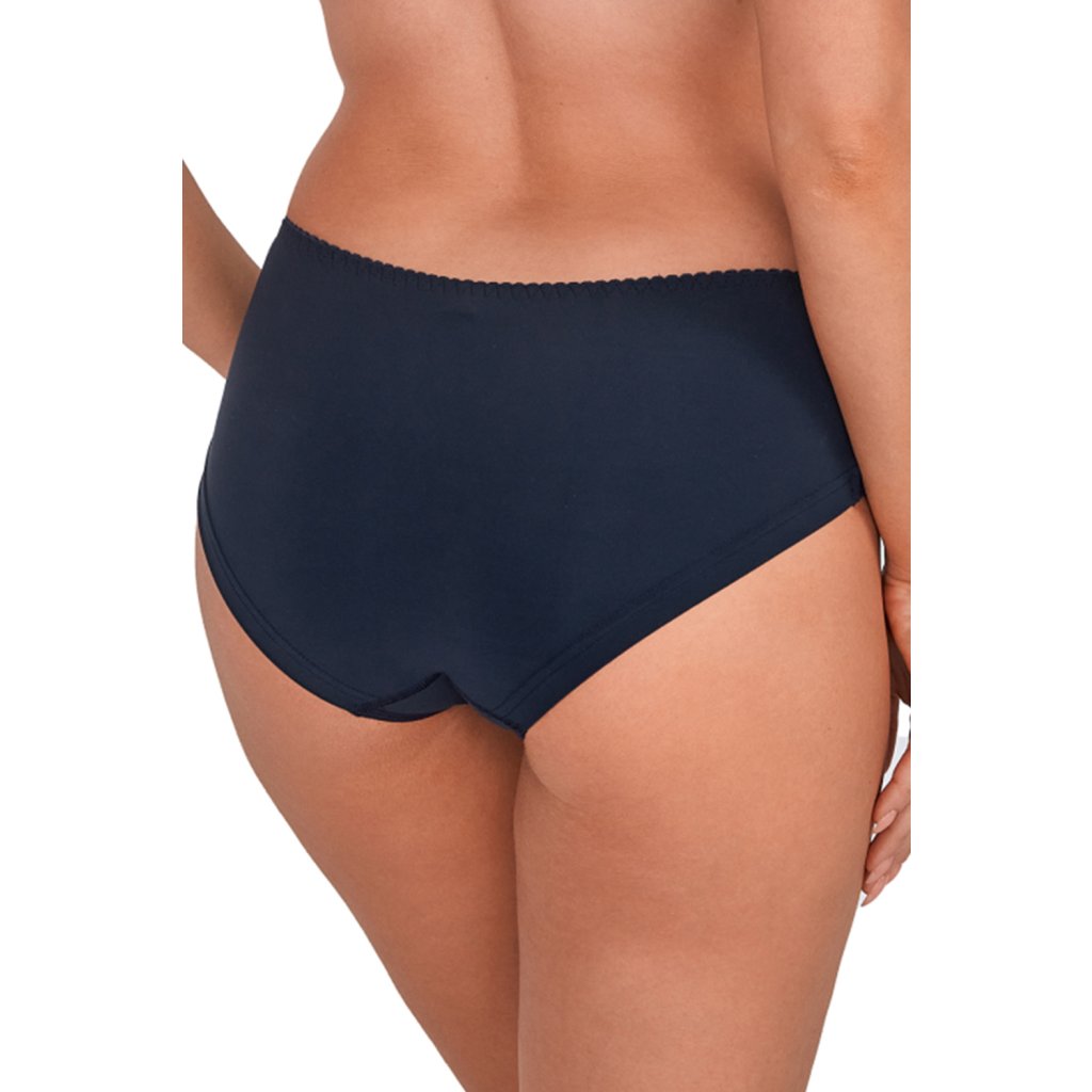 Elegantní kalhotky v tmavě modré barvě. - klasický střih - plný střih - celé vyrobeno z hladkého úpletu - výšivky a síťované vsadky na přední straně Do kompletu doporučujeme podprsenku 1209. Složení: 45% polyamid, 30% polyester, 12% elastan, 10% bavlna.