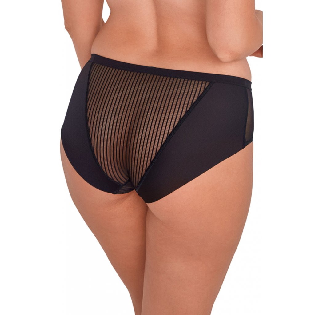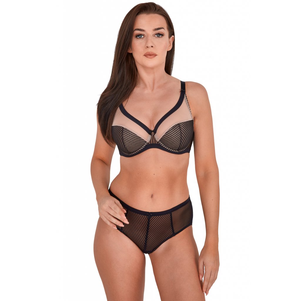 Elegantní kalhotky. - klasický střih - plný střih - celá vyrobena ze síťoviny a pruhované síťoviny - přední část je podšitá béžovou síťovinou - široká guma v pase - nožičky vzadu jsou z dvojitě skládaného materiálu Na doplnění sady doporučujeme podprsenku 1211. Složení: 72% polyamid, 18% elastan, 10% bavlna.