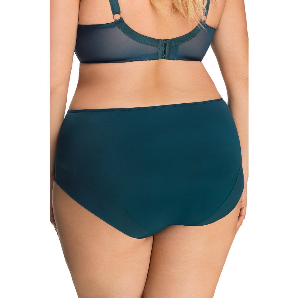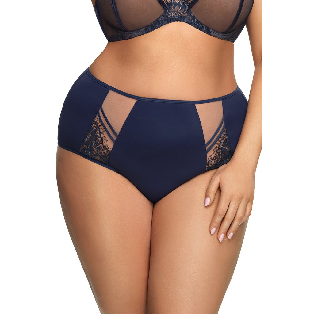 Elegantní vysoké dámské kalhotky, které jsou vyrobené z měkkého mikrovlákna. Model je ve přední části ozdobený dvěma vsadkami z béžového tylu a z jemné černé krajky. Zadní díl kalhotek je hladký. Nohavičky jsou ve přední části olemované hladkou tenkou pružnou páskou. Vzadu nohavičky lemuje hladce složený dvojitý pružný tyl.