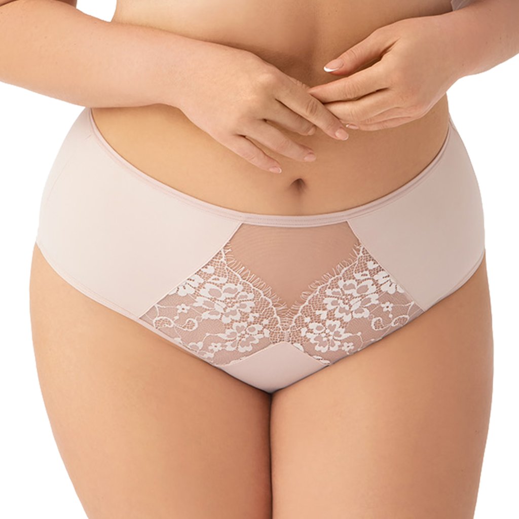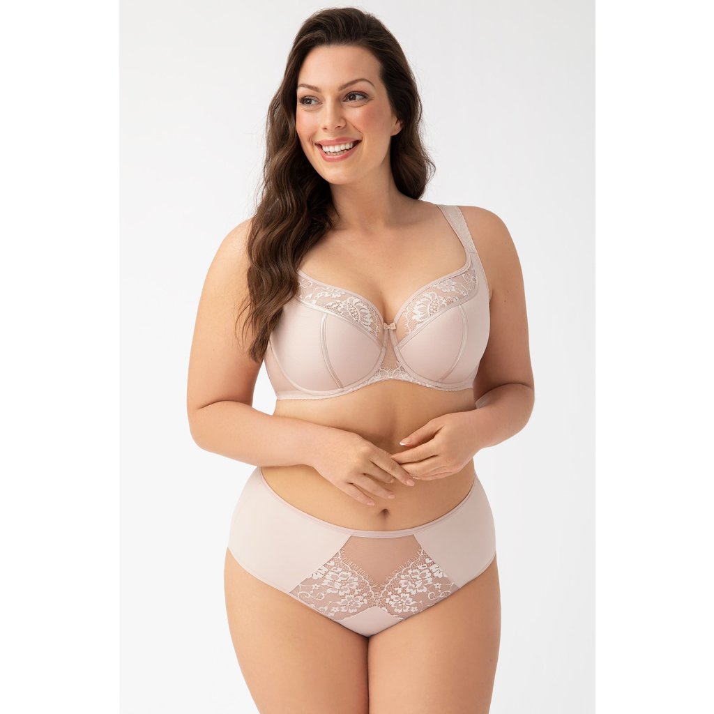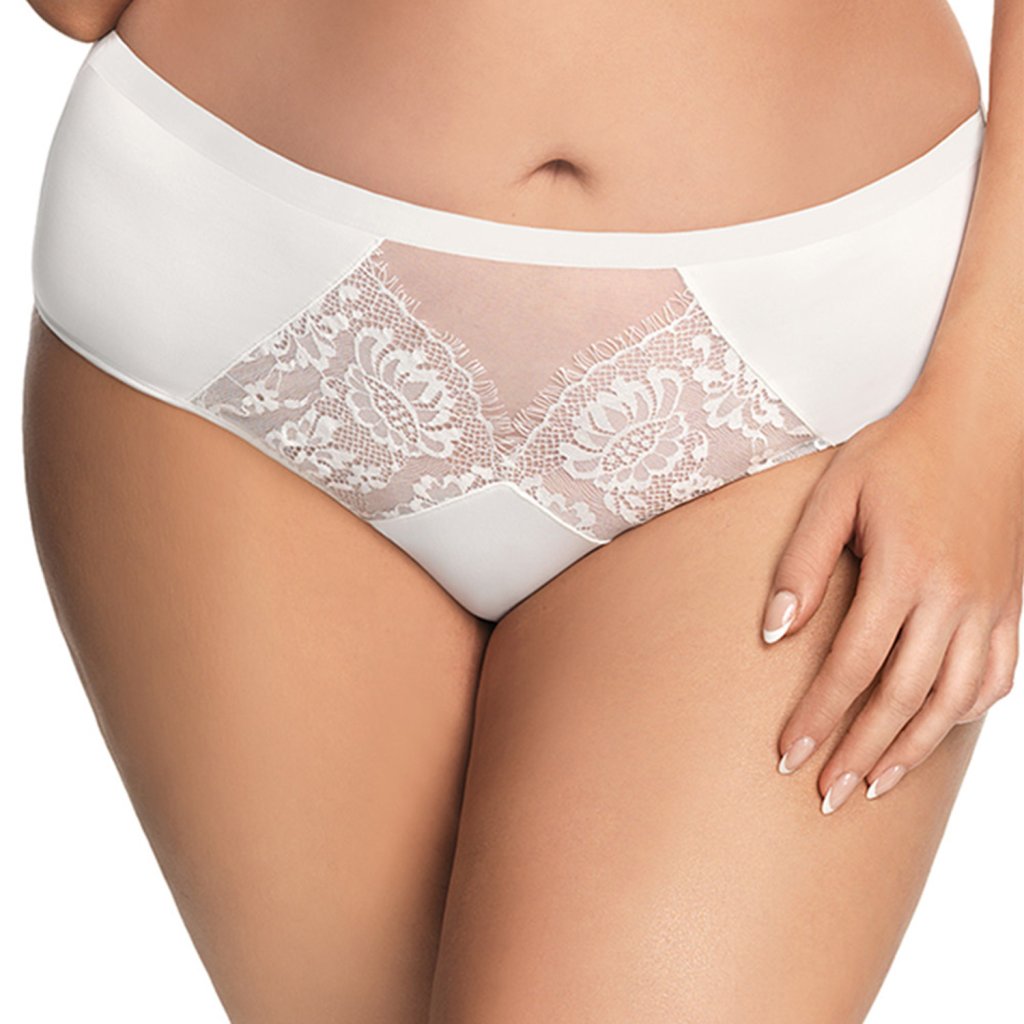 Elegantní kalhotky s vysokým pasem. Vyrobeno z měkkého mikrovlákna zdobeného tylem a jemnými krajkovými vsadkami na přední a zadní straně. Zpět hladce. Nožičky na přední straně jsou zakončené hladkou gumičkou. Zadní nohy jsou zakončeny hladkou dvojitě skládanou tylovou gumou.