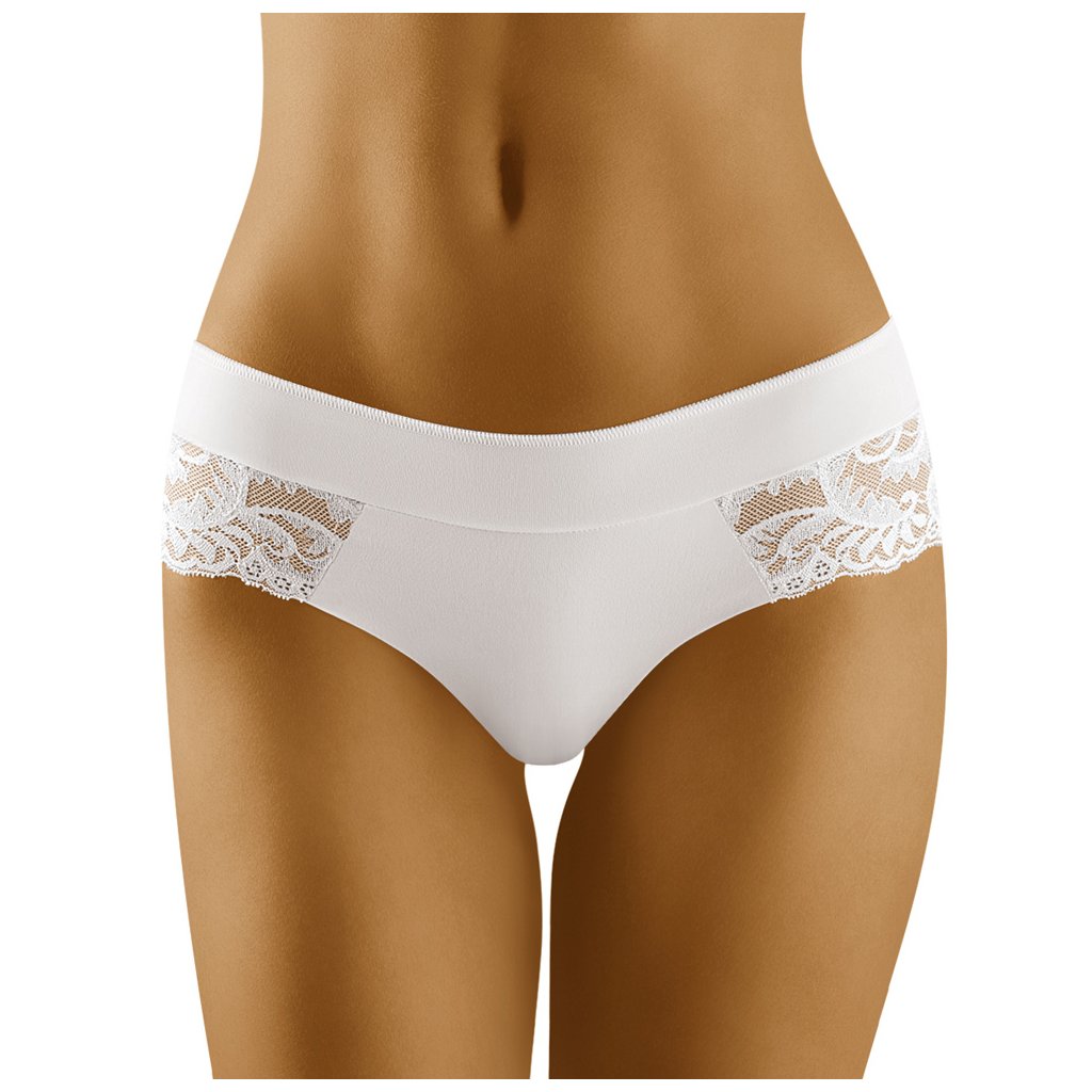 Dámské bezešvé francouzské černé kalhotky s krajkovým lemem. Krajka vytváří romantický dojem. Nachází se v zadní části i na bocích. Kalhotky jsou střižené ze tří dílů bílé elastické neprůhledné tkaniny. Jsou vytvořeny bez postranních švů. Horní lem je lehce obšitý, boční lemy jsou střižené laserem, neobšité. Kalhotky jsou doplněné o bavlněný klín.Doplňkové parametry