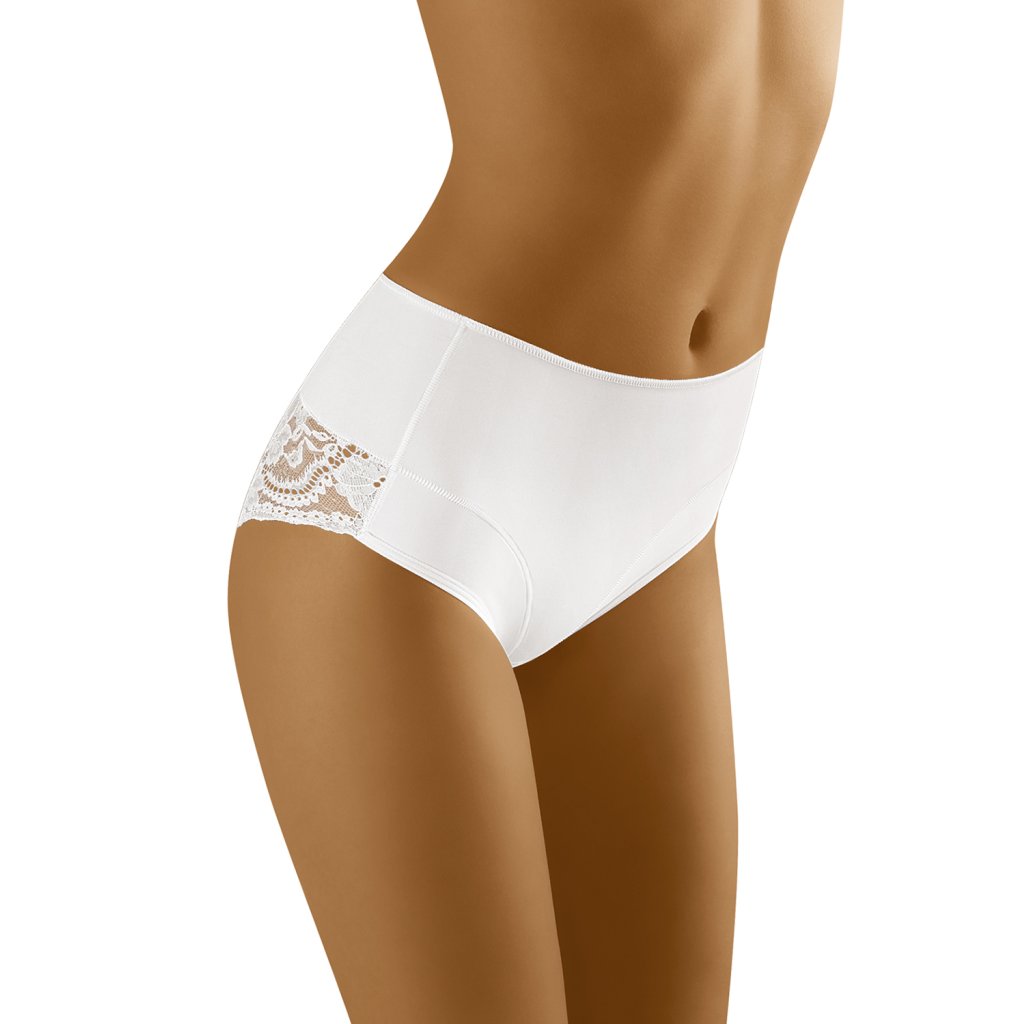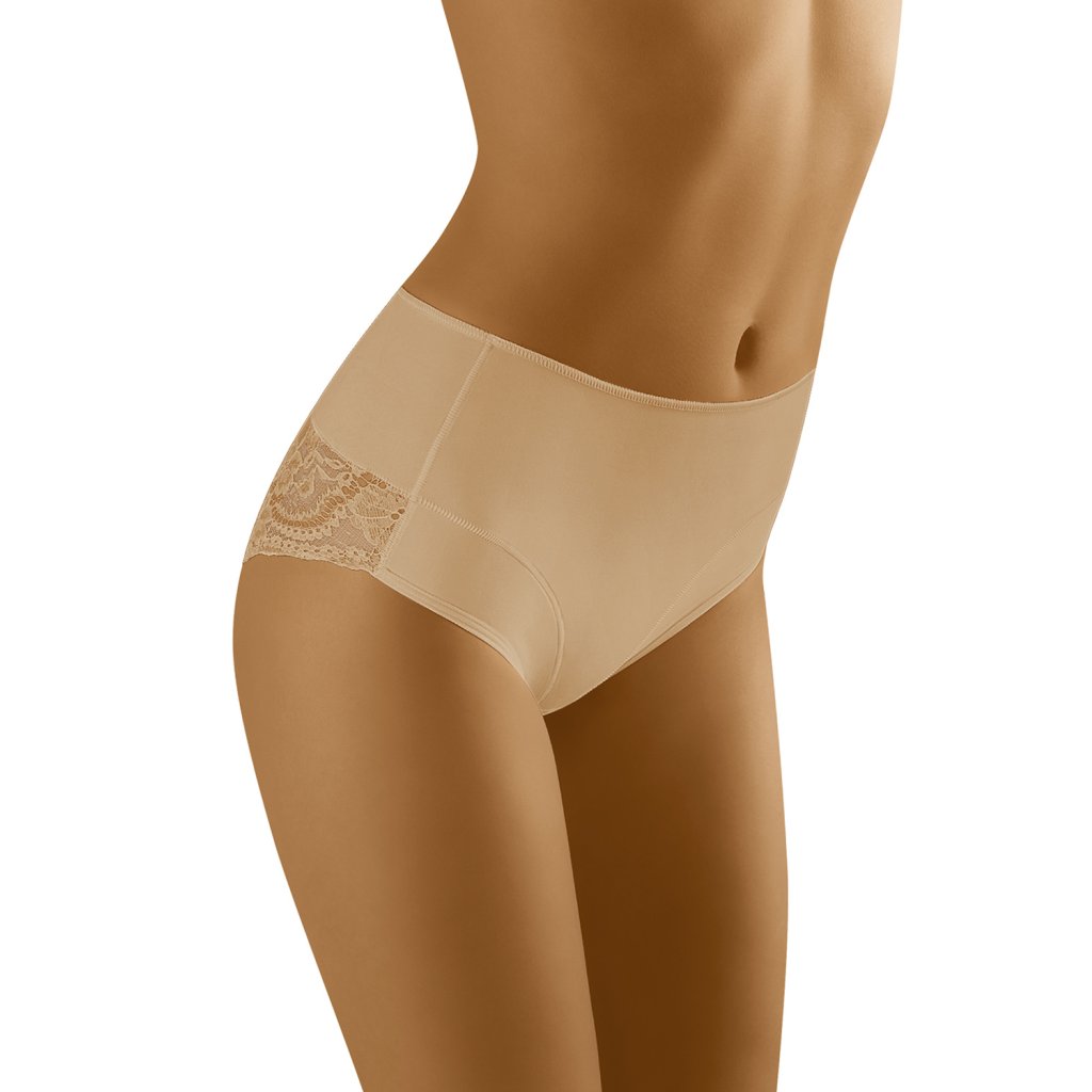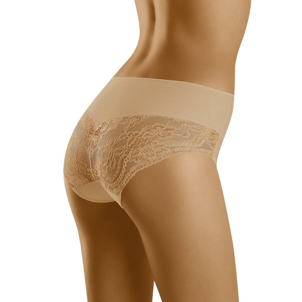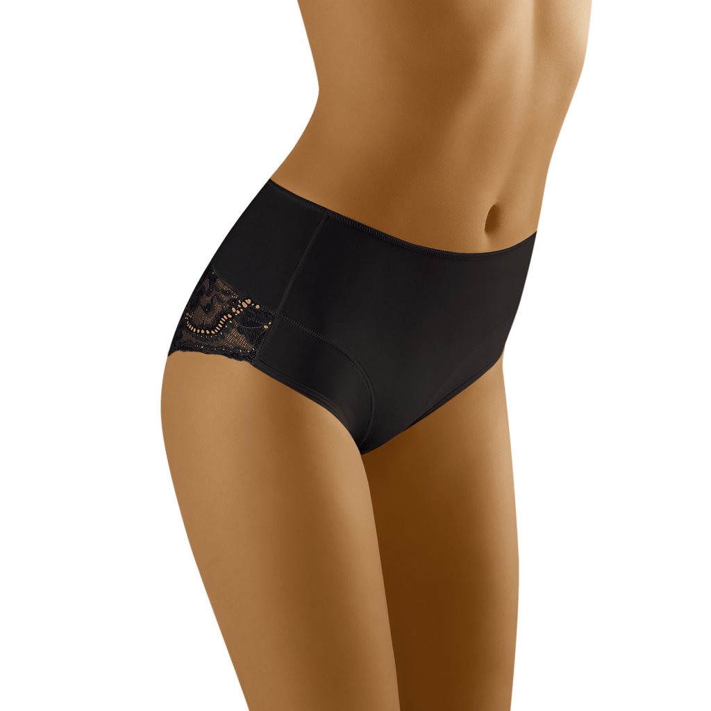 Dámské kalhotky Misteria Wolbar stáhnou v oblasti boku a bříška ploché švy zadní díl zdobený krásnou krajkouvyrobené z jemného pevného mikrovlákna s velkým podílem elastanuv pase tenká gumav rozkroku podšité bavlnouMateriálové složení: 58% polyamid + 42% elastanDoplňkové parametry