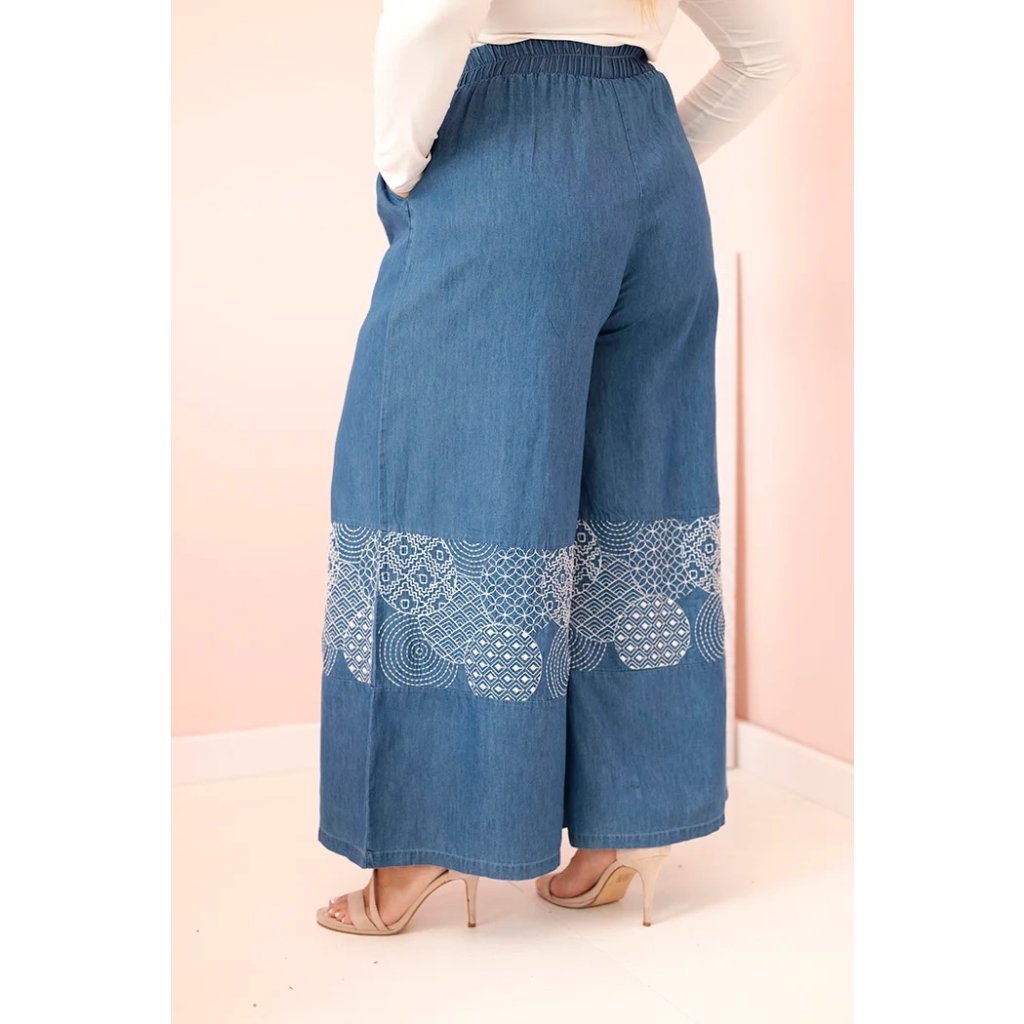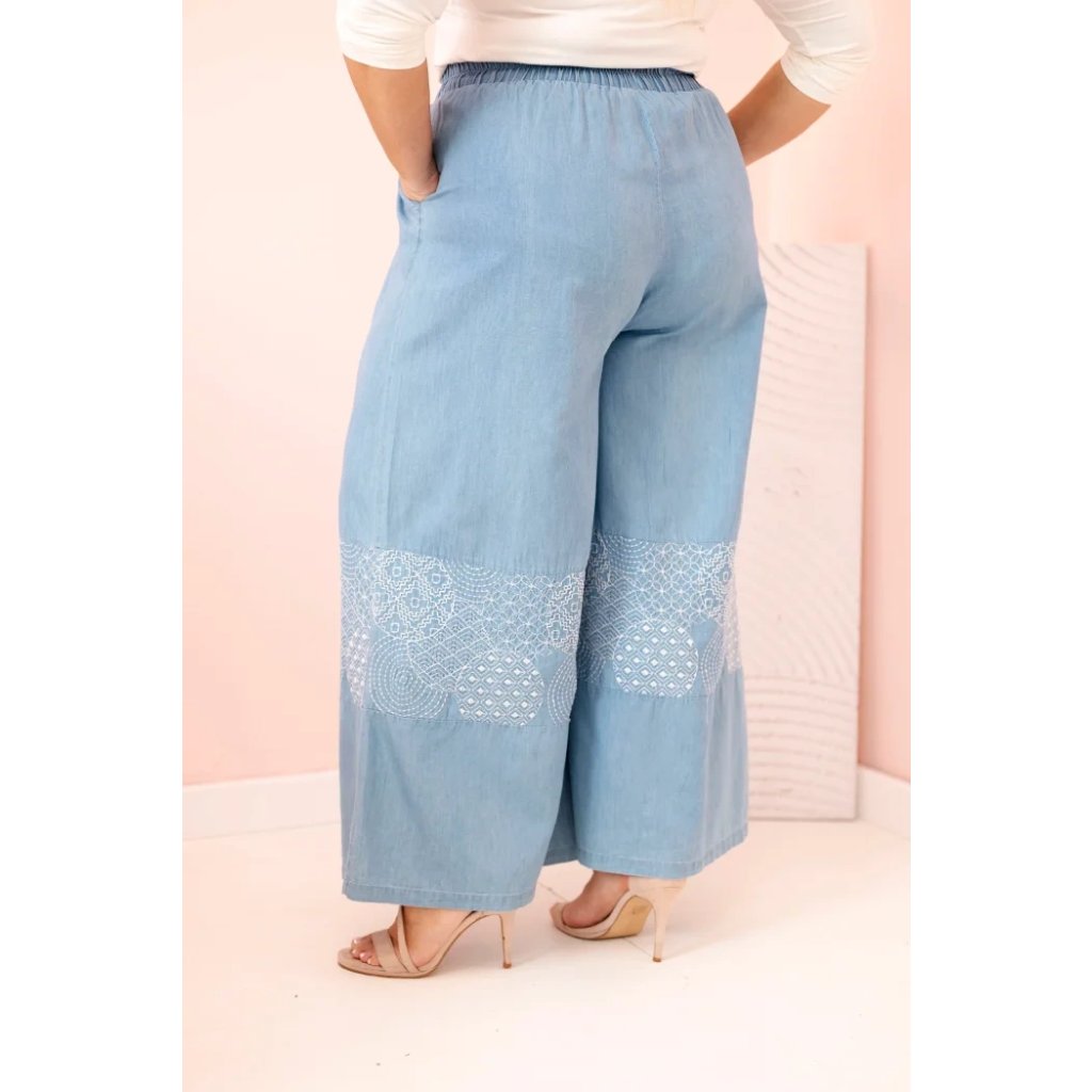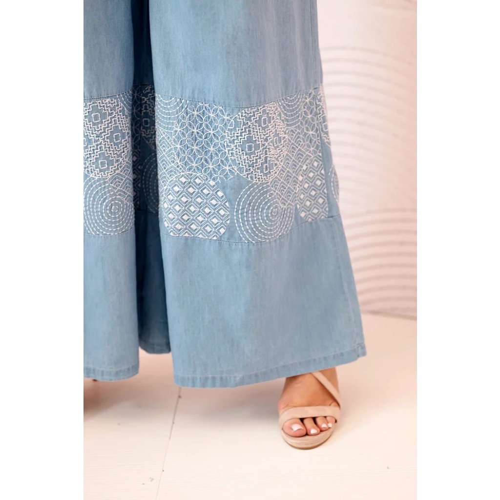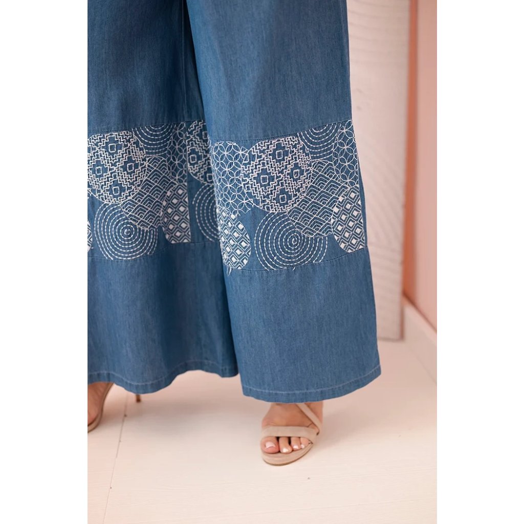 Tyto výjimečné dámské kalhoty jsou ideální volbou pro ženy, které si cení pohodlí, stylu a originálního designu. Vyrobené z měkkého a příjemného materiálu poskytují pohodlí po celý den. Široké nohavice jim dodávají lehkost a volnost, zatímco ozdobná etnická výšivka na spodku nohavic jim přidává jedinečný charakter. Skvěle se hodí jak na běžné nošení, tak i na letní výlety, procházky nebo setkání s přáteli. Kalhoty se výborně kombinují s jednoduchými halenkami, topy nebo lehkými košilemi. Díky elastickému pasu se snadno přizpůsobí postavě, což zvyšuje komfort nošení.