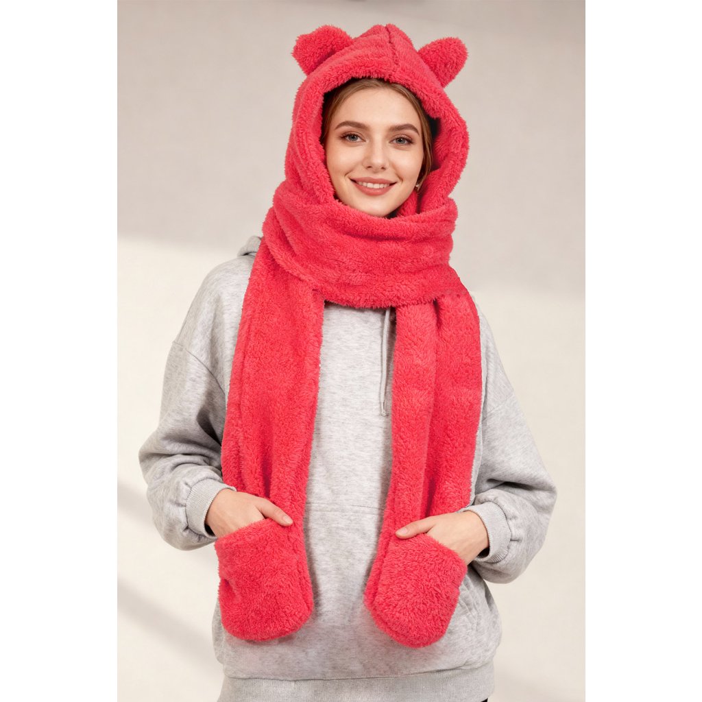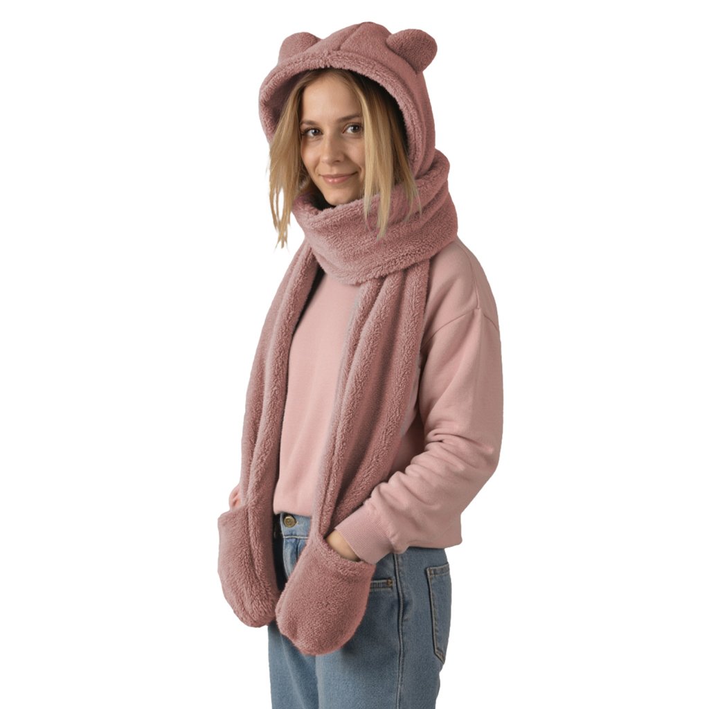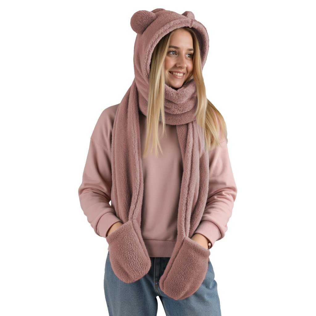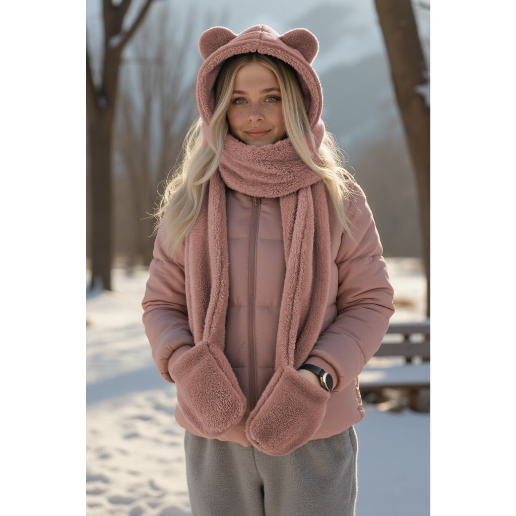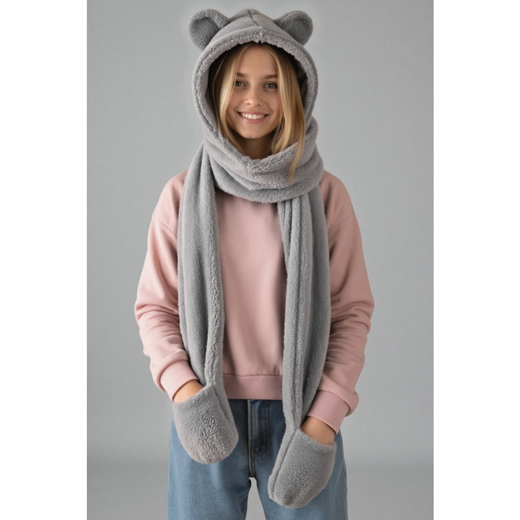 Rozkošná kapuce s medvídkem - jedinečná kombinace stylu a funkčnosti. Model 3v1 - kapuce, šála a rukavice univerzální velikost čepice s roztomilými aplikacemi ve tvaru ucha vyrobeno z měkkého a jemného materiálu.- dlouhé uši