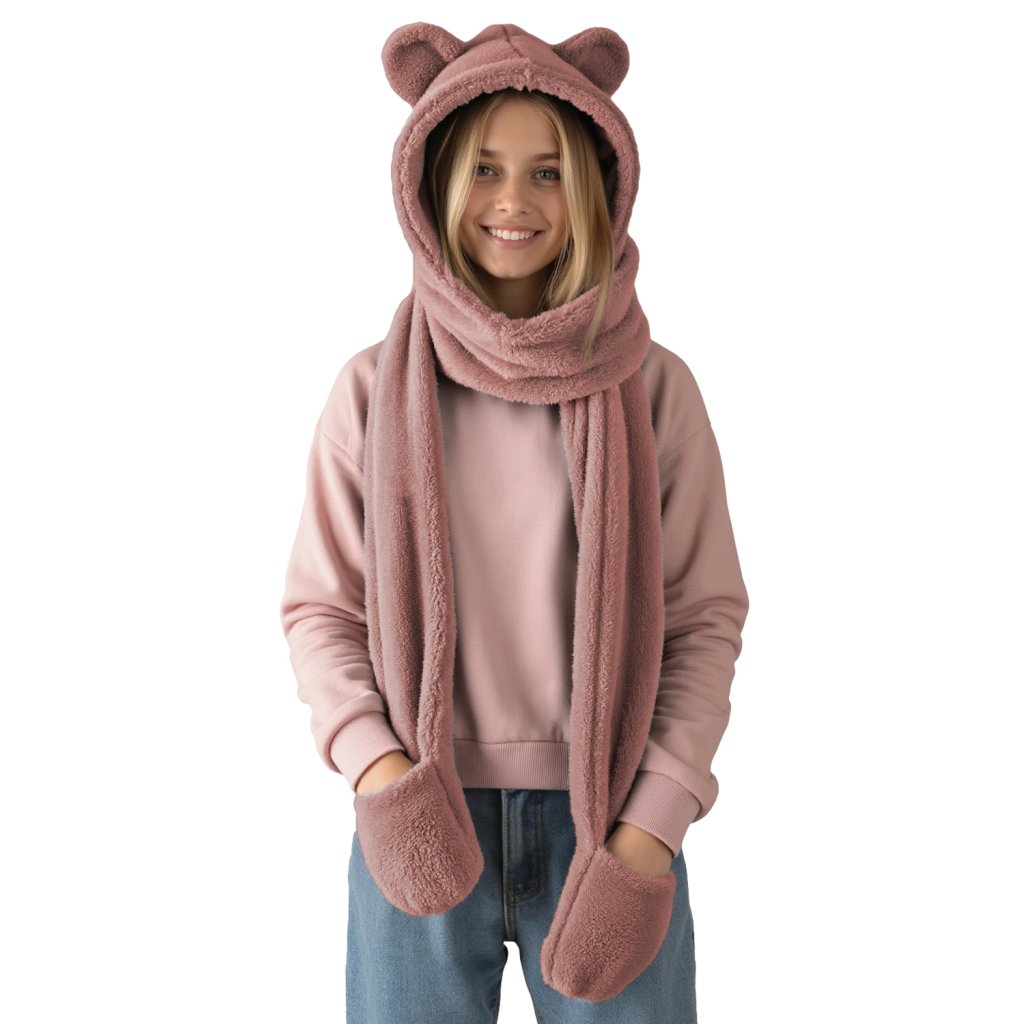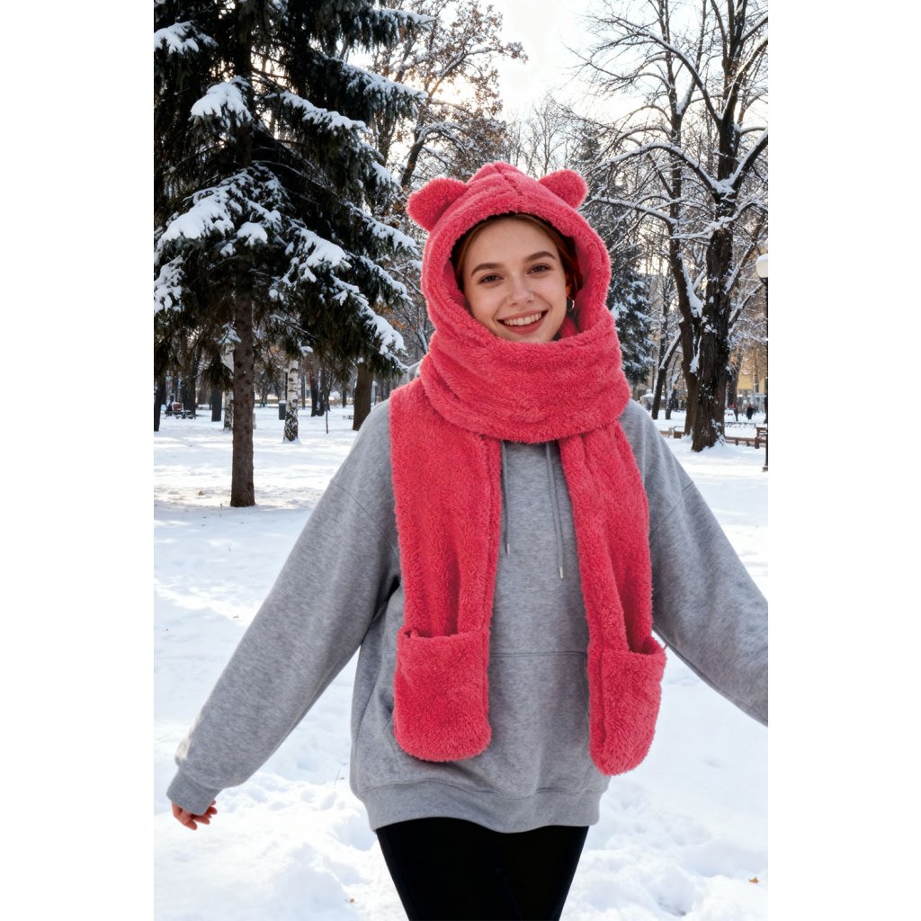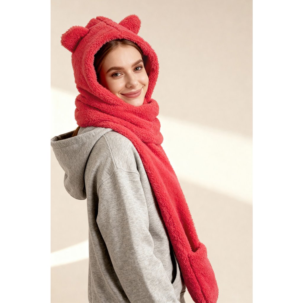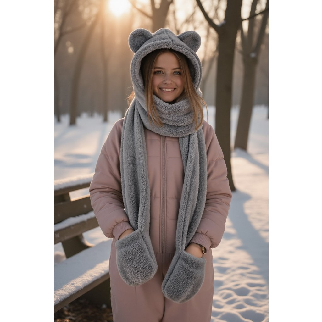 Rozkošná kapuce s medvídkem - jedinečná kombinace stylu a funkčnosti. Model 3v1 - kapuce, šála a rukavice univerzální velikost čepice s roztomilými aplikacemi ve tvaru ucha vyrobeno z měkkého a jemného materiálu.- dlouhé uši