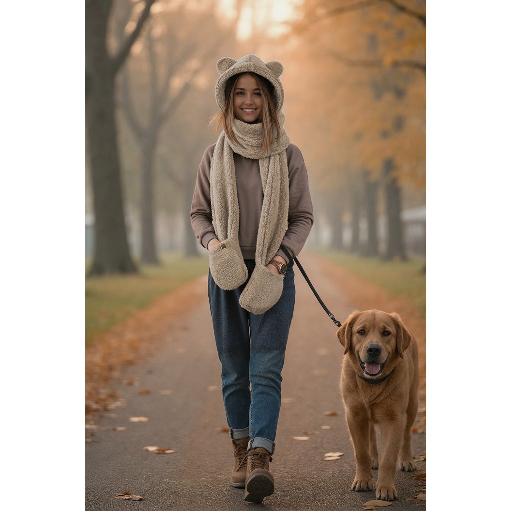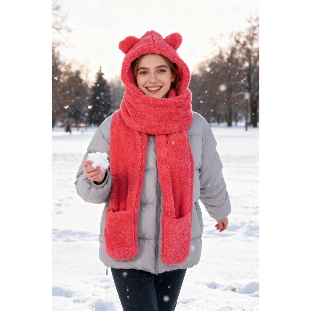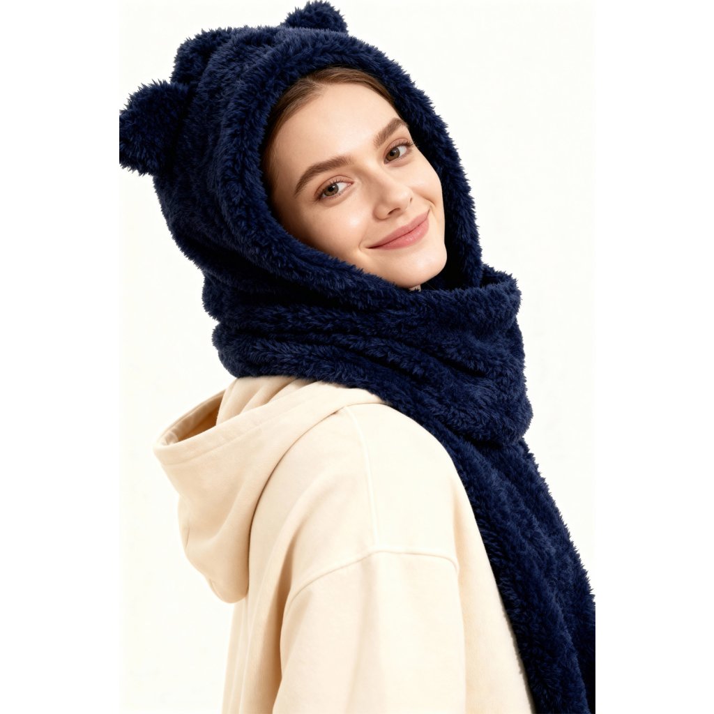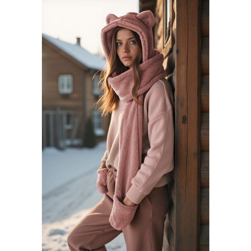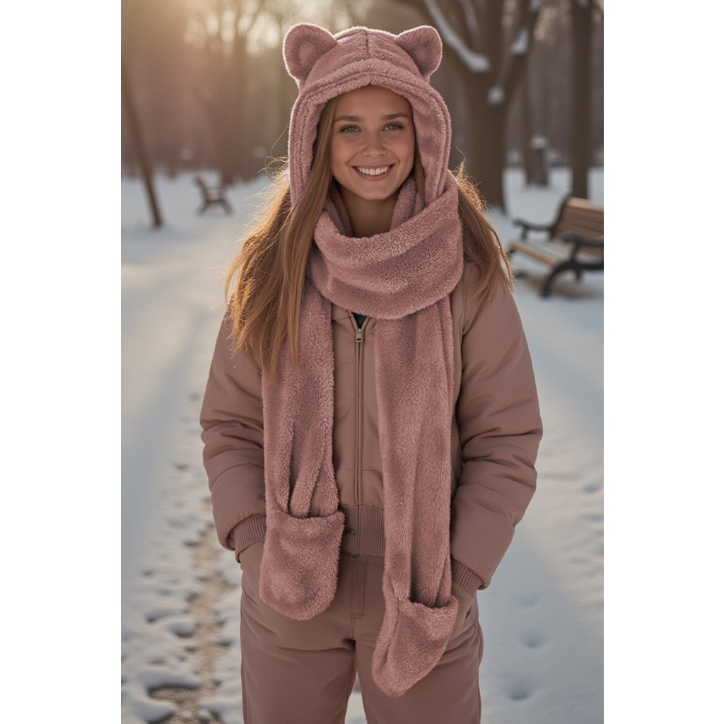 Rozkošná kapuce s medvídkem - jedinečná kombinace stylu a funkčnosti. Model 3v1 - kapuce, šála a rukavice univerzální velikost čepice s roztomilými aplikacemi ve tvaru ucha vyrobeno z měkkého a jemného materiálu.- dlouhé uši