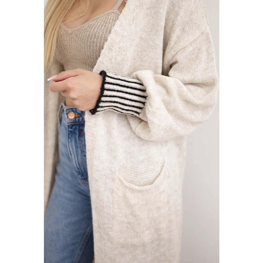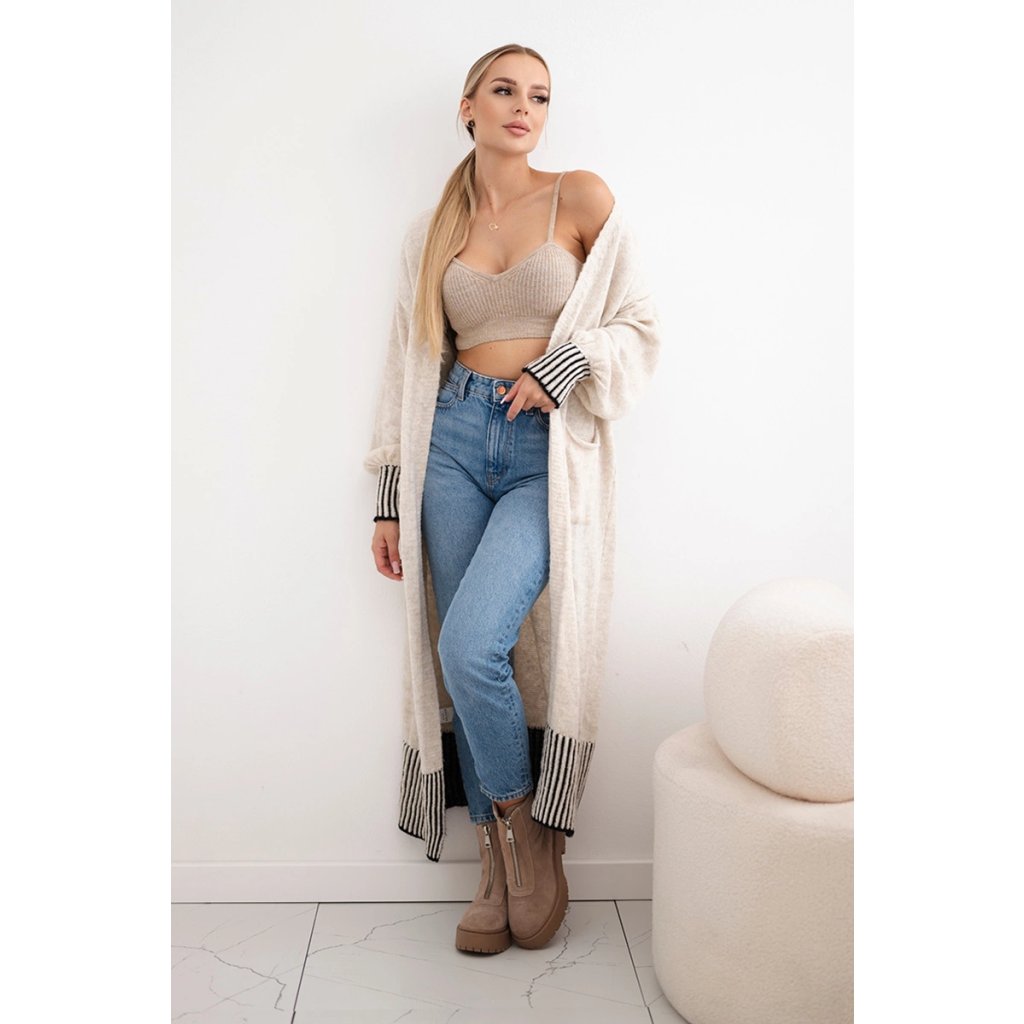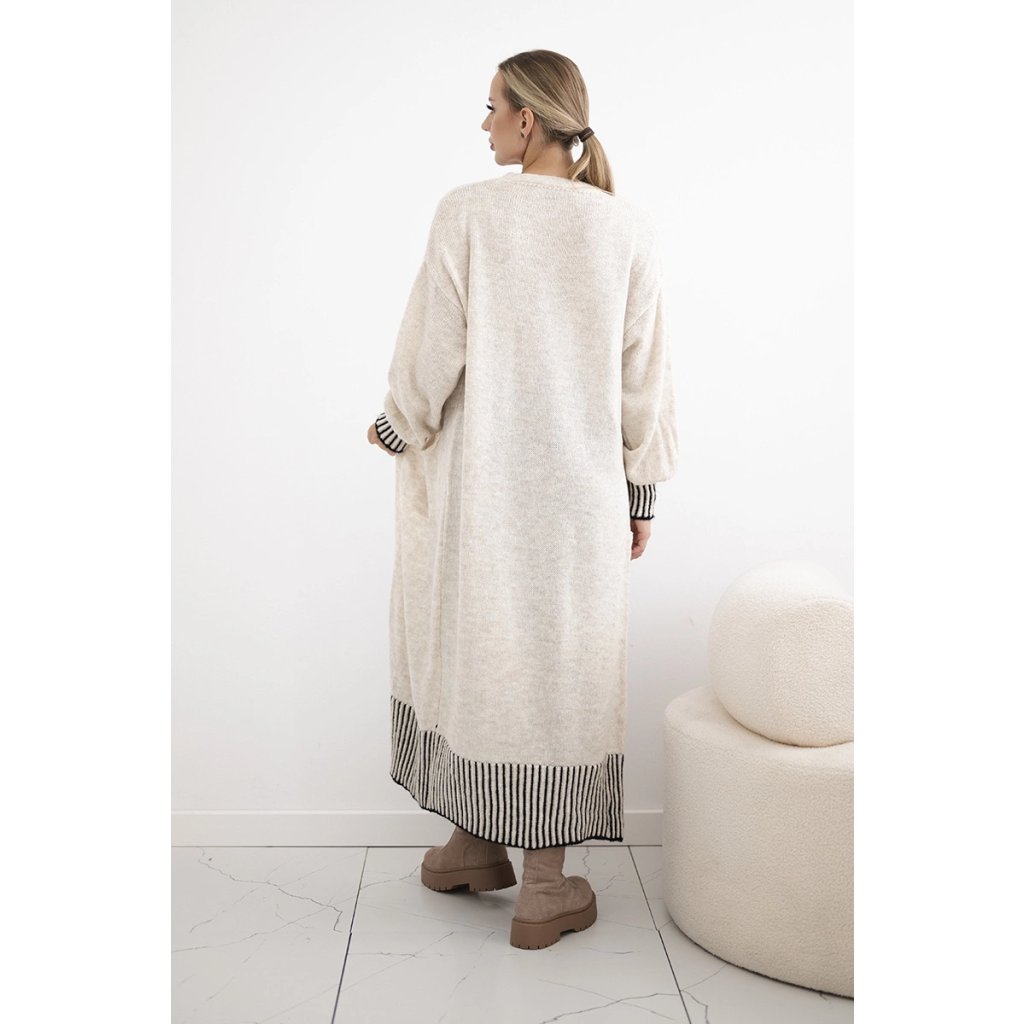 Dlouhý kardigan s kapsami vyrobený v Itálii je výjimečně stylový a funkční kousek oblečení, ideální do chladnějších dnů. Vyrobeno z vysoce kvalitních materiálů, poskytuje teplo a pohodlí. Má praktické kapsy a ozdobné manžety na rukávech a ve spodní části svetru mu dodávají elegantní vzhled a originální charakter. Tento kardigan je ideální pro ležérní styling a jeho delší střih poskytuje dodatečnou ochranu před chladem a zároveň zvýrazňuje postavu. Velikost je univerzální a bude vhodná pro ženy, které nosí velikost S, M nebo L.