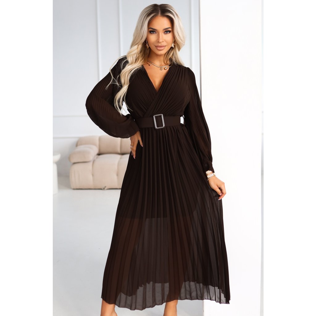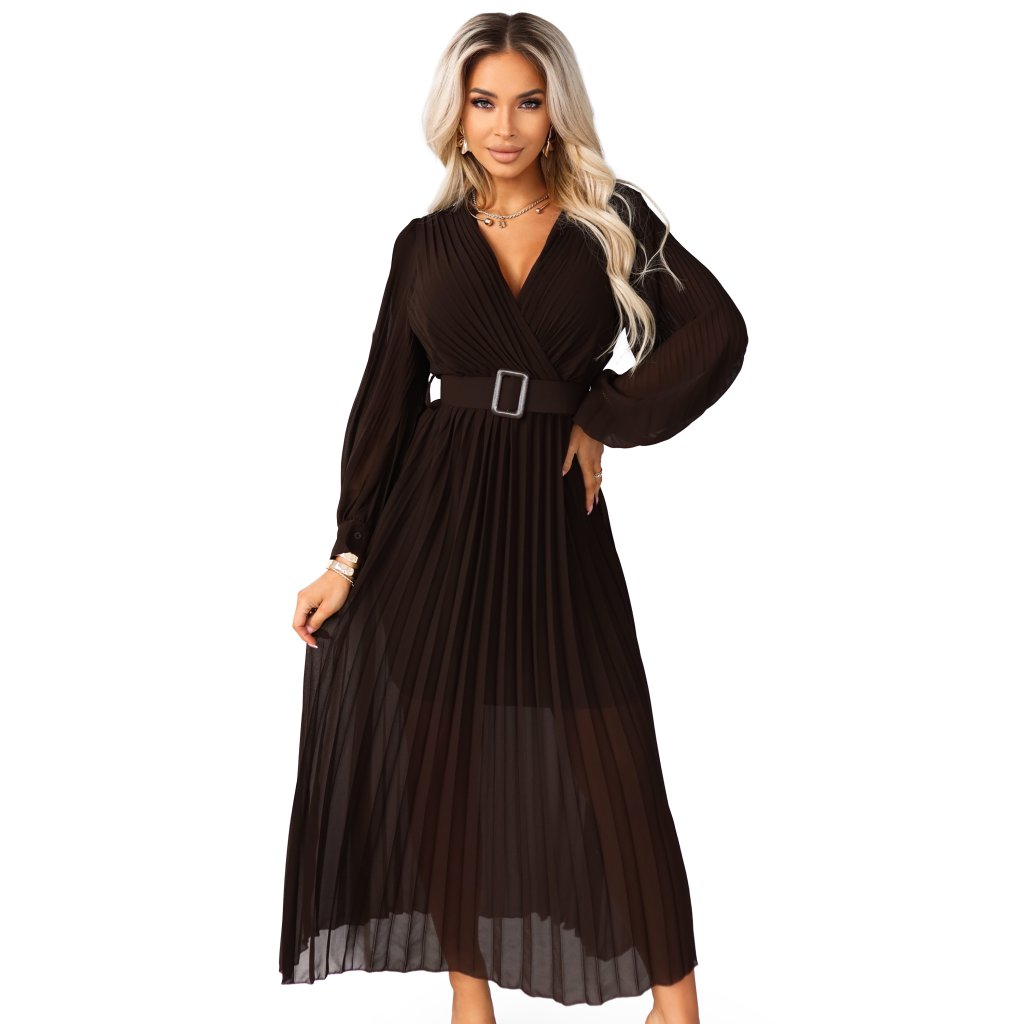 Čokoládové plisované midi šaty s páskem a výstřihem - Numoco Basic