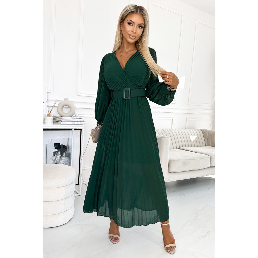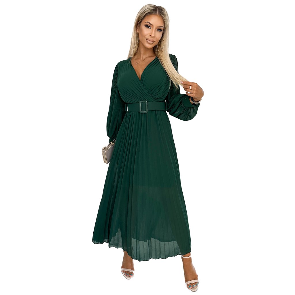 Klára - řasené šifonové šaty s výstřihem, dlouhým rukávem a páskem. Řasení na výstřihu a rukávu dodává šatům eleganci. Barva: lahvově zelená. Značka Numoco.