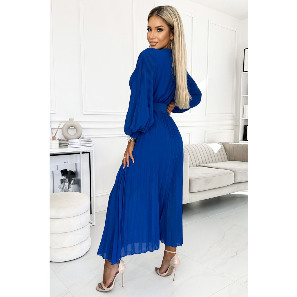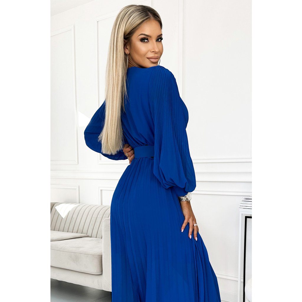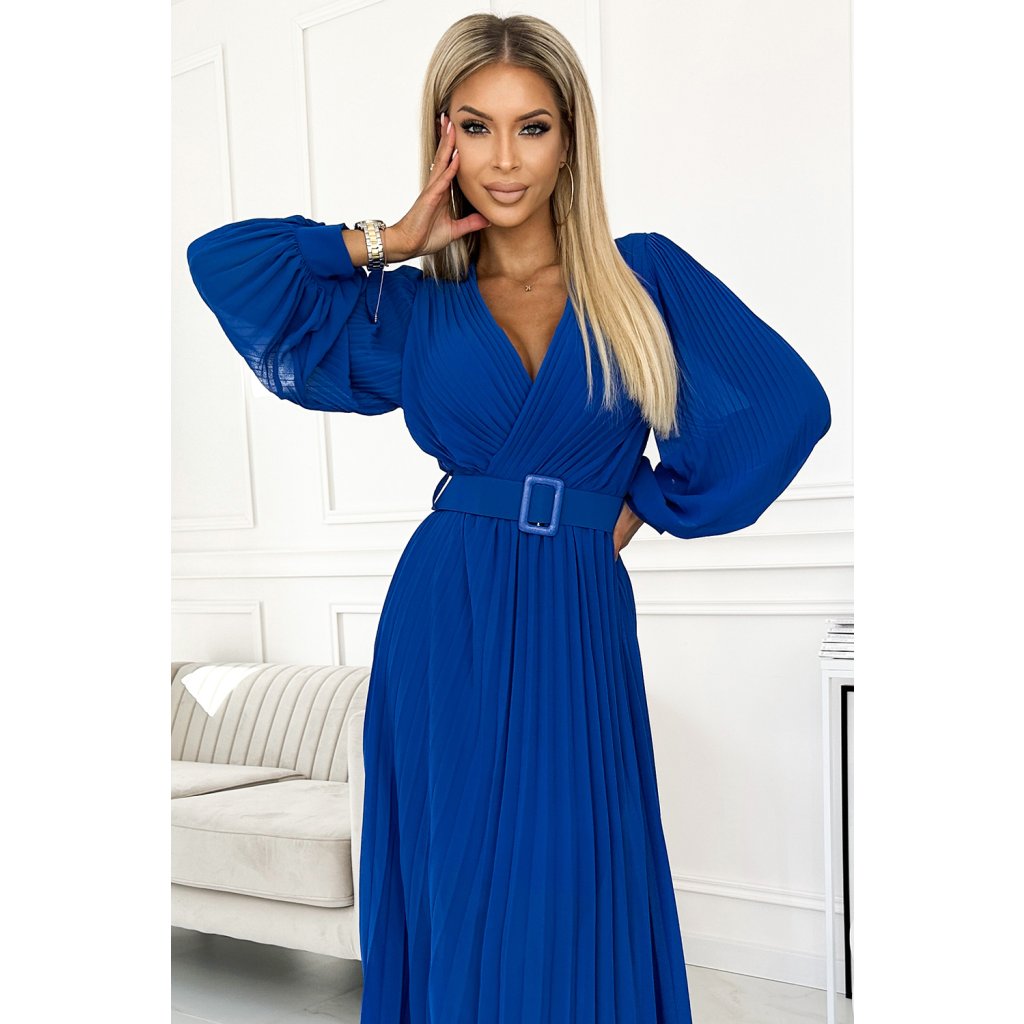 Klára - řasené šifonové šaty s výstřihem, dlouhým rukávem a páskem. Řasení na výstřihu a rukávu dodává šatům eleganci. Barva: modrá. Značka Numoco.